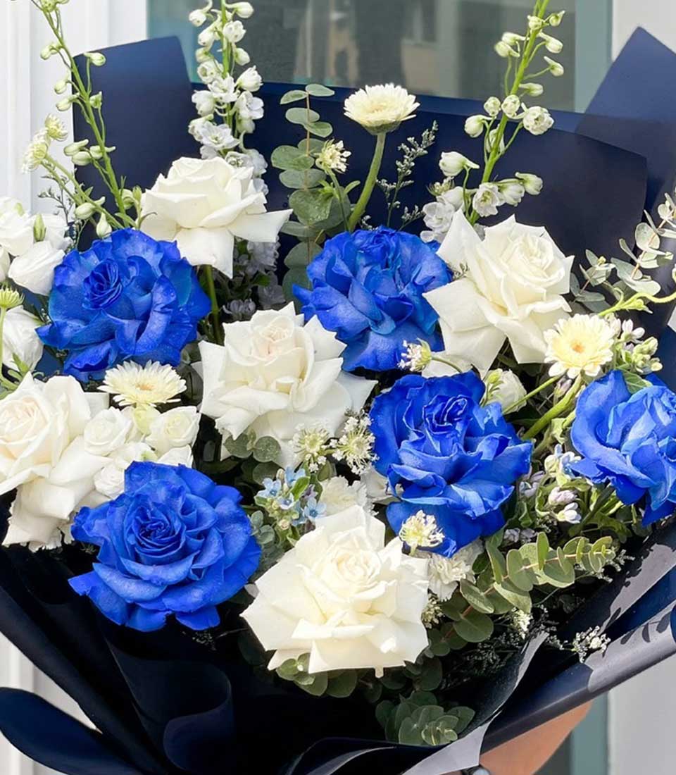 Gentle Romantic Blooms Roses Bouquet Celebrate love and elegance with our Gentle Romantic Blooms bouquet, featuring stunning blue and white roses. This exquisite arrangement blends soft hues for a sophisticated and romantic touch, making it a perfect gift for any special occasion.