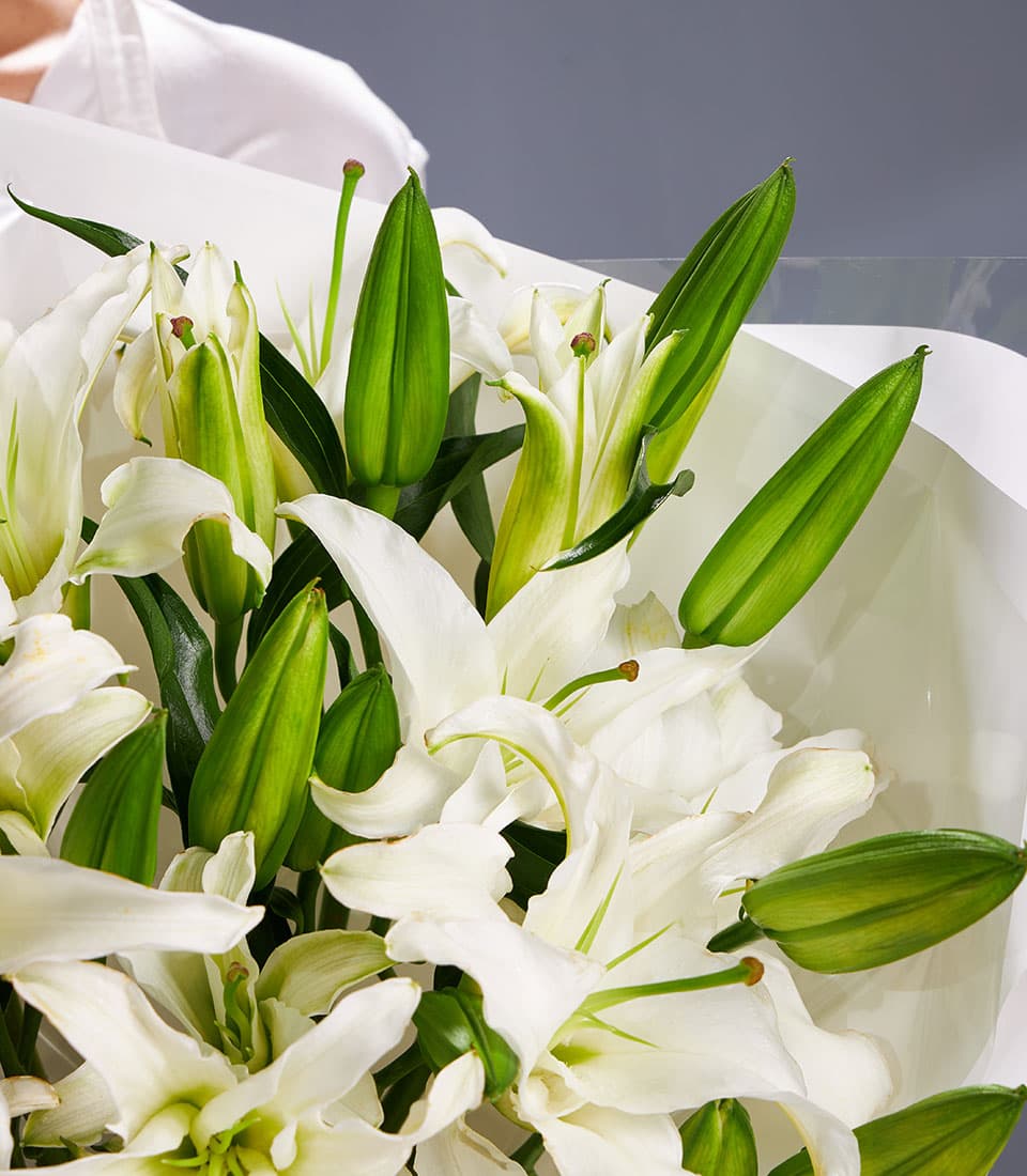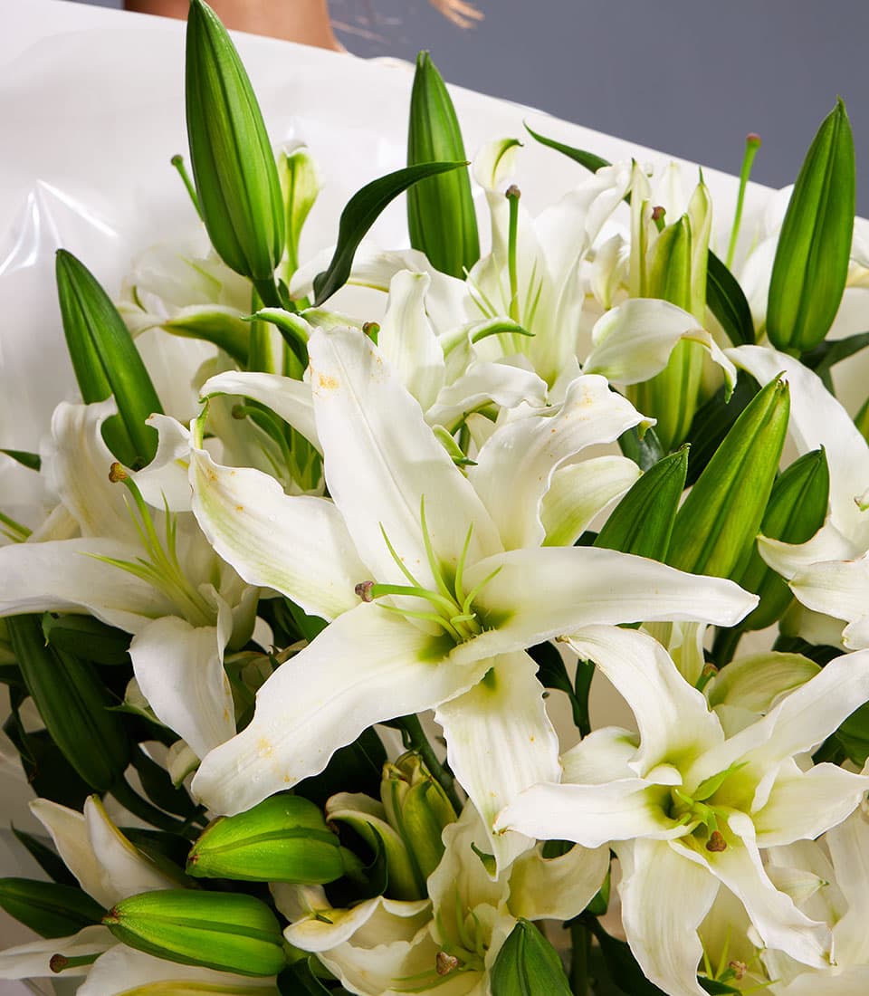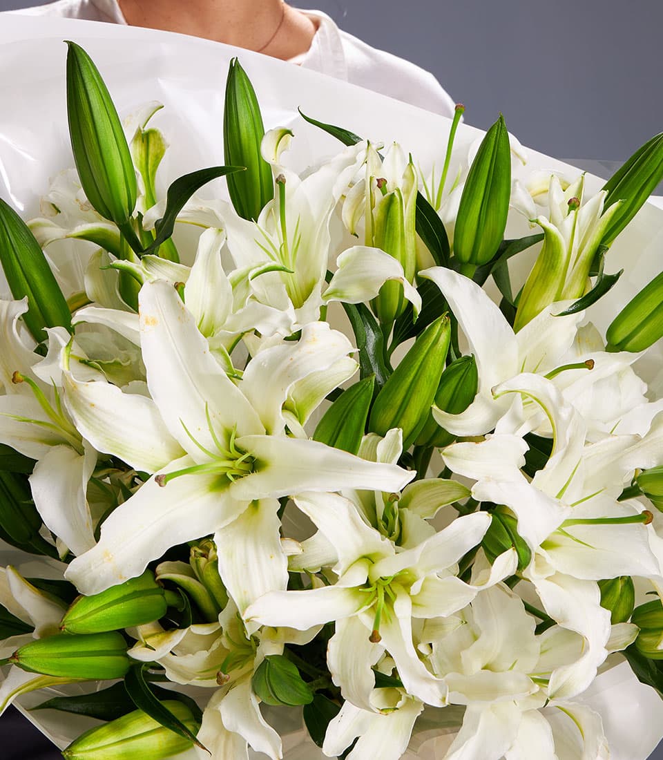 Elegant bouquet of fresh white lilies symbolising purity grace and devotion perfect for weddings anniversaries sympathy flowers and premium gifts