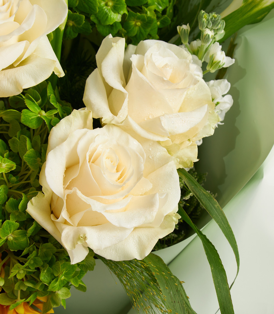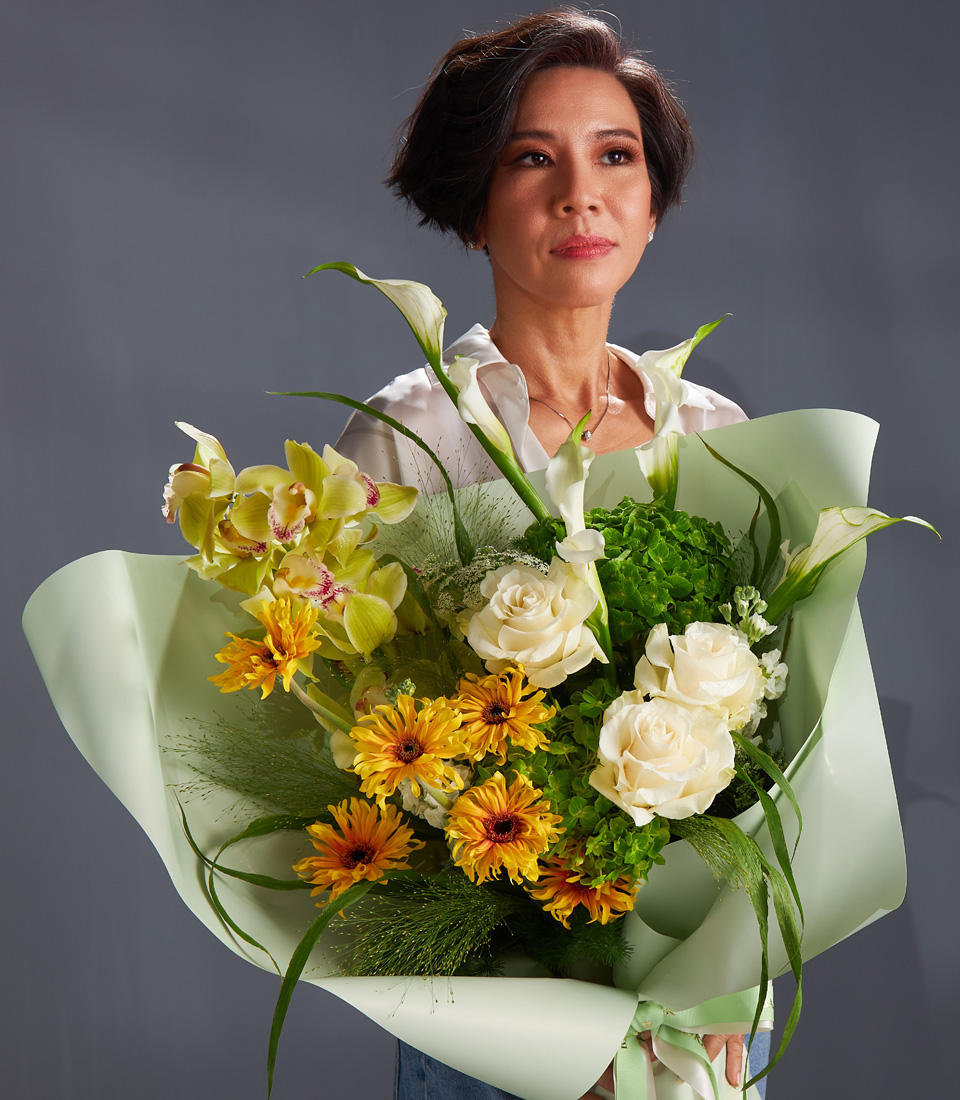 Elegant bouquet of white roses green hydrangeas orchids and yellow gerberas beautifully arranged for luxury flower delivery in Bangkok