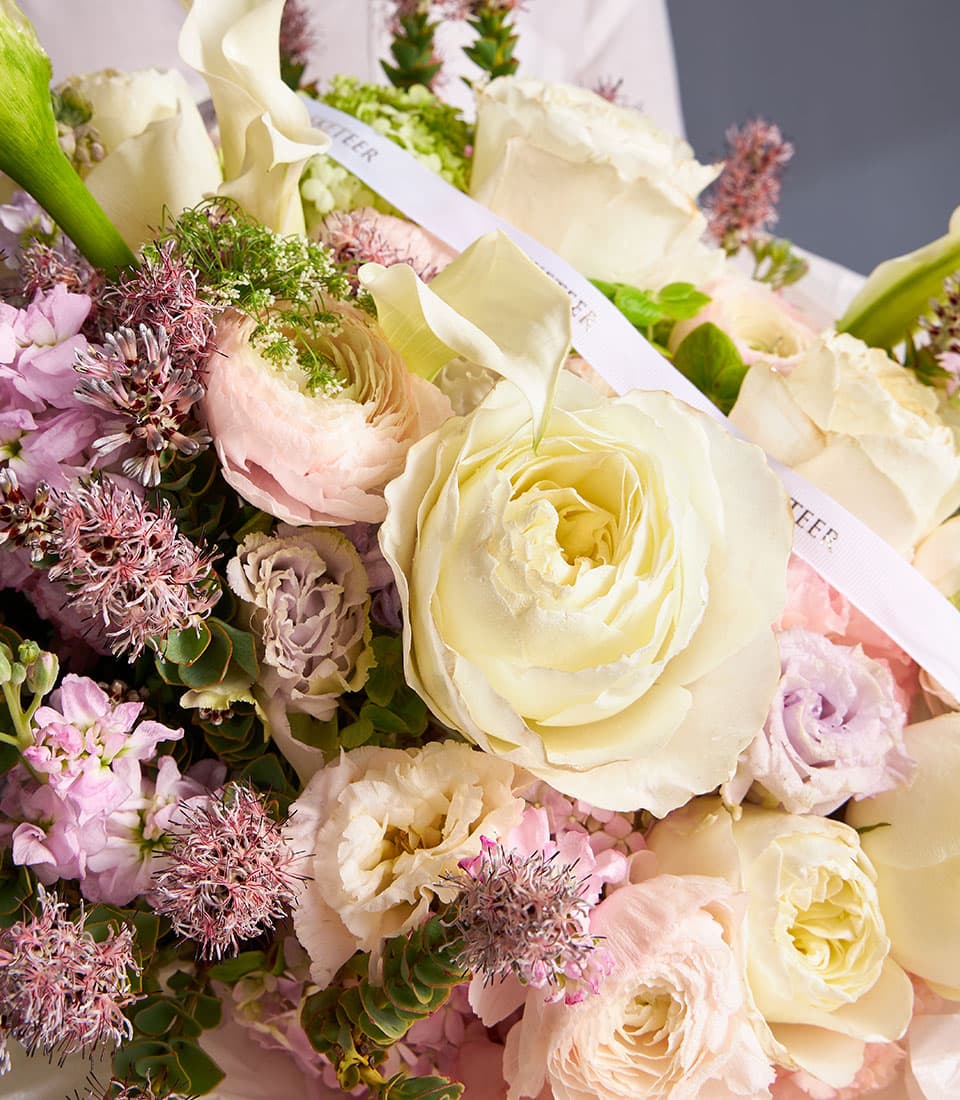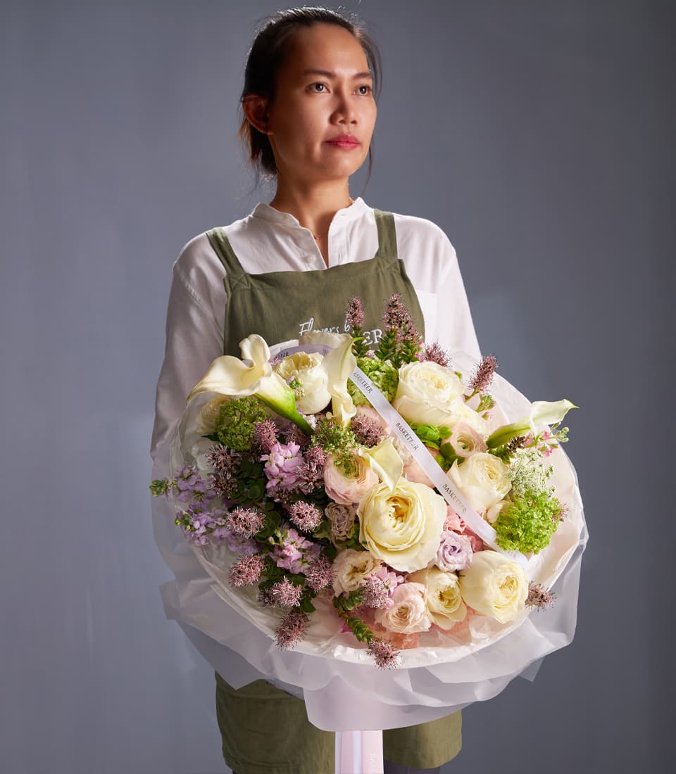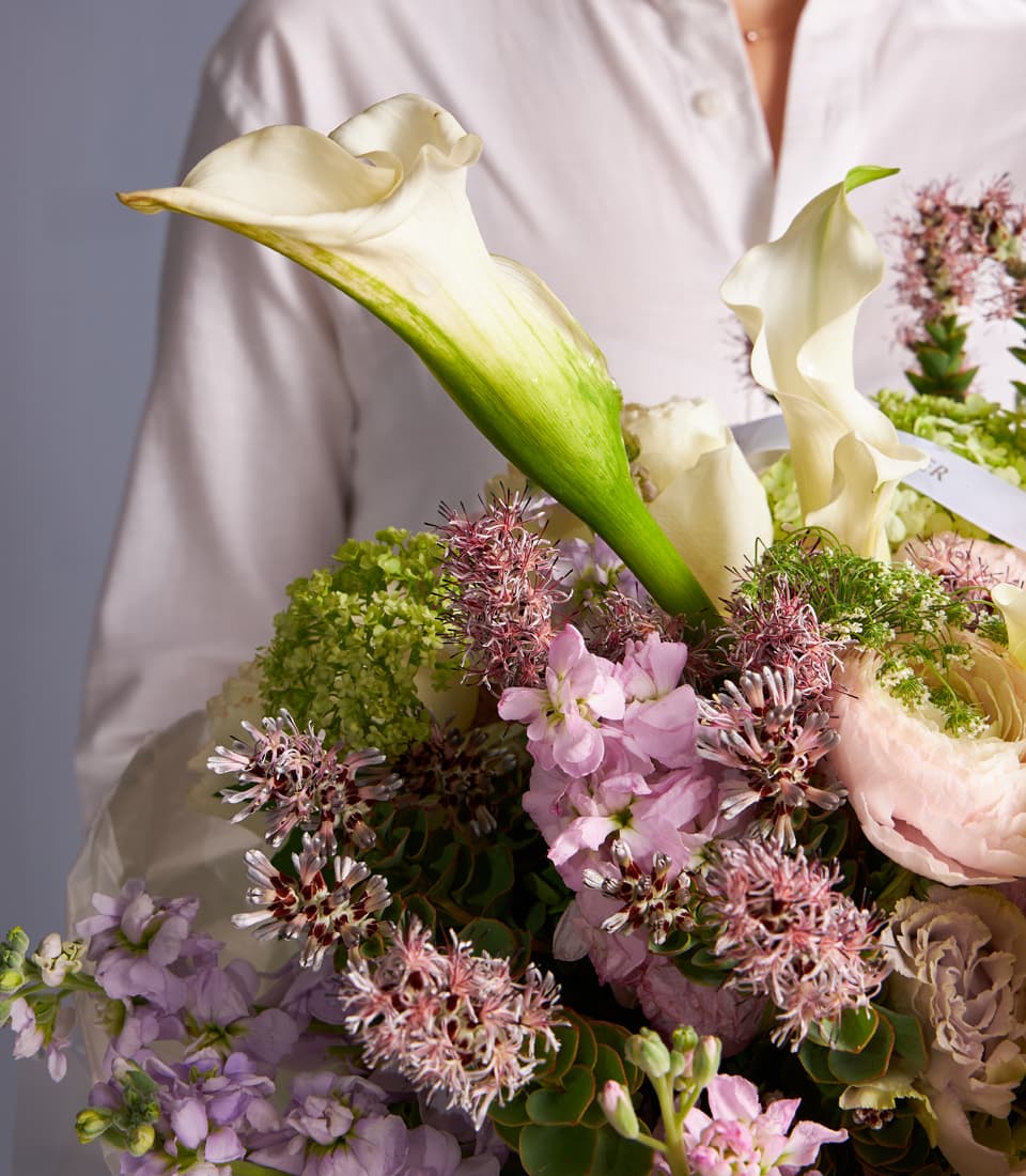 Luxury mixed flower bouquet with white roses, calla lilies, lilac blooms, and lush textures. Perfect for weddings, anniversaries, or premium delivery in Bangkok