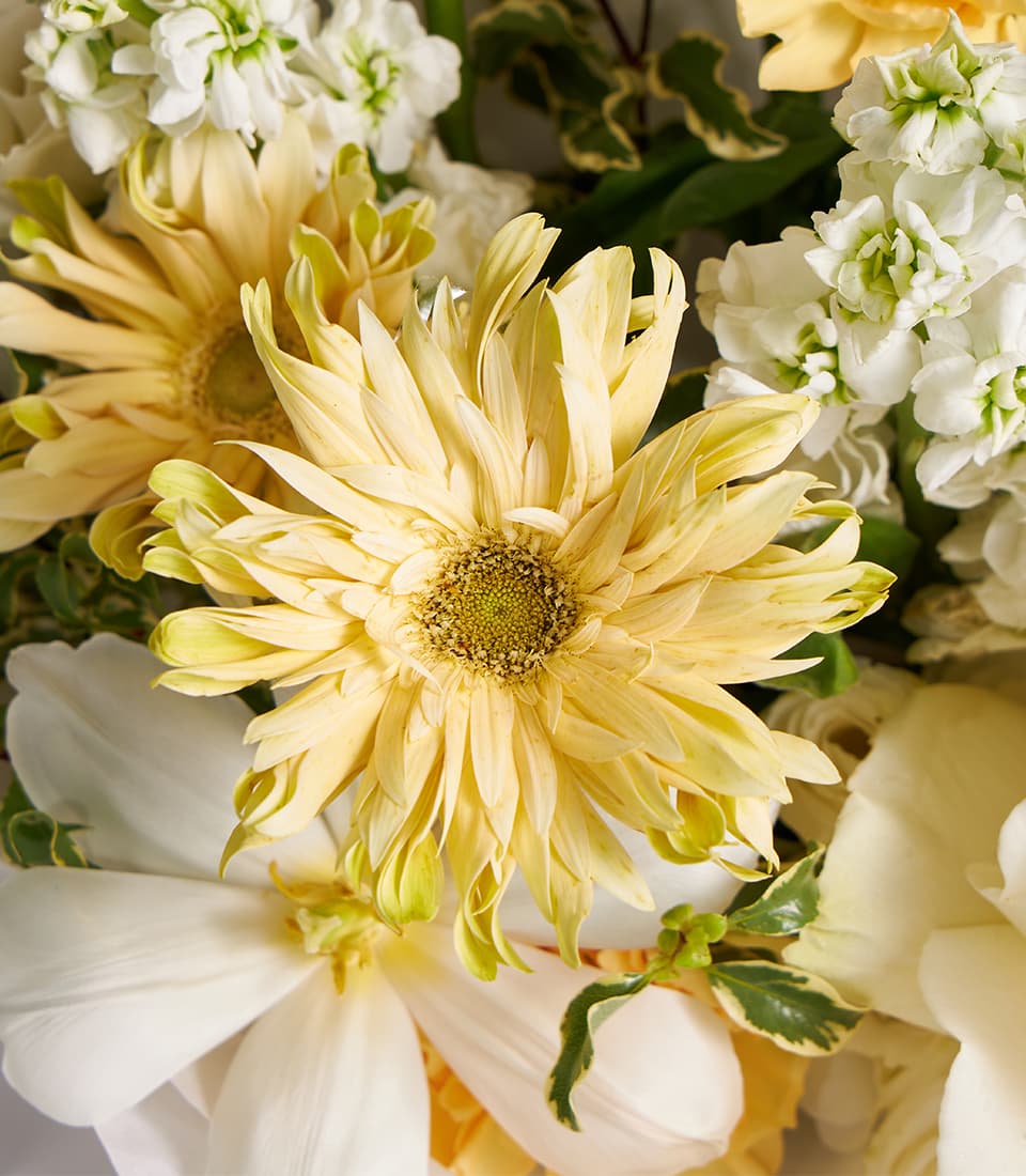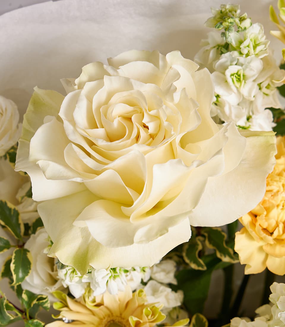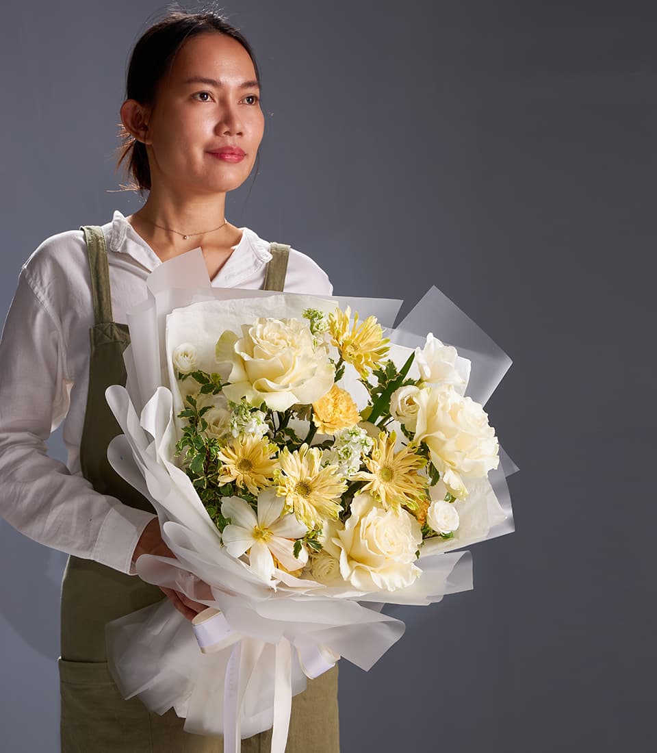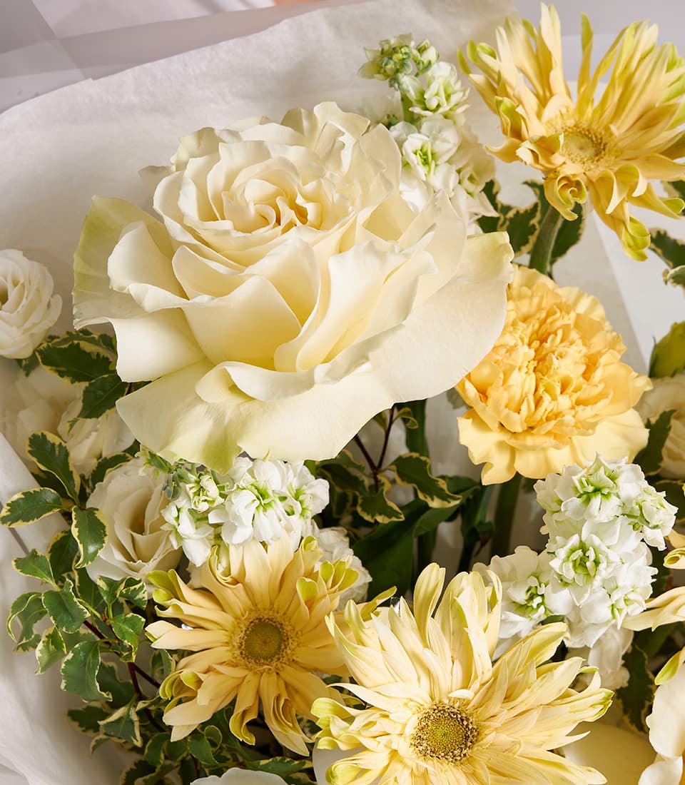 Send timeless beauty with a bouquet of white roses, cream carnations, gerberas, and seasonal blooms, wrapped in white for pure eleganc
