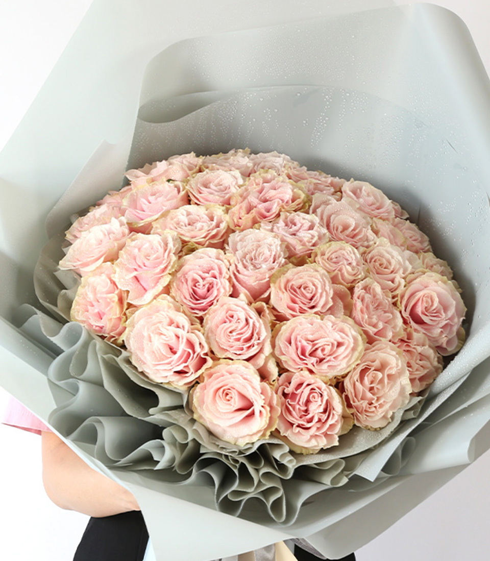 Delight in the beauty of blush roses, elegantly arranged in a soft grey wrap. Perfect for any occasion, offering timeless sophistication and grace.