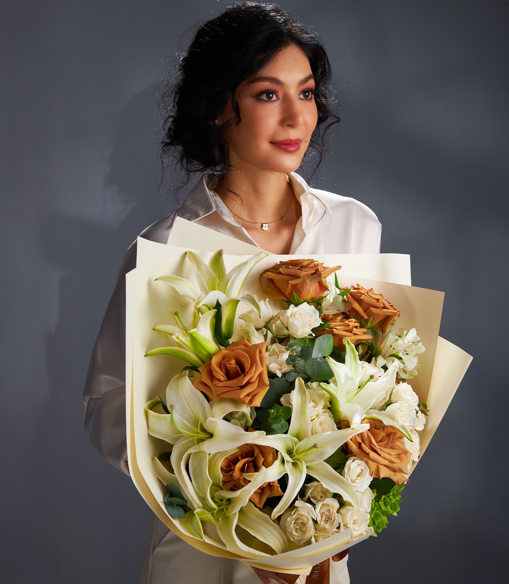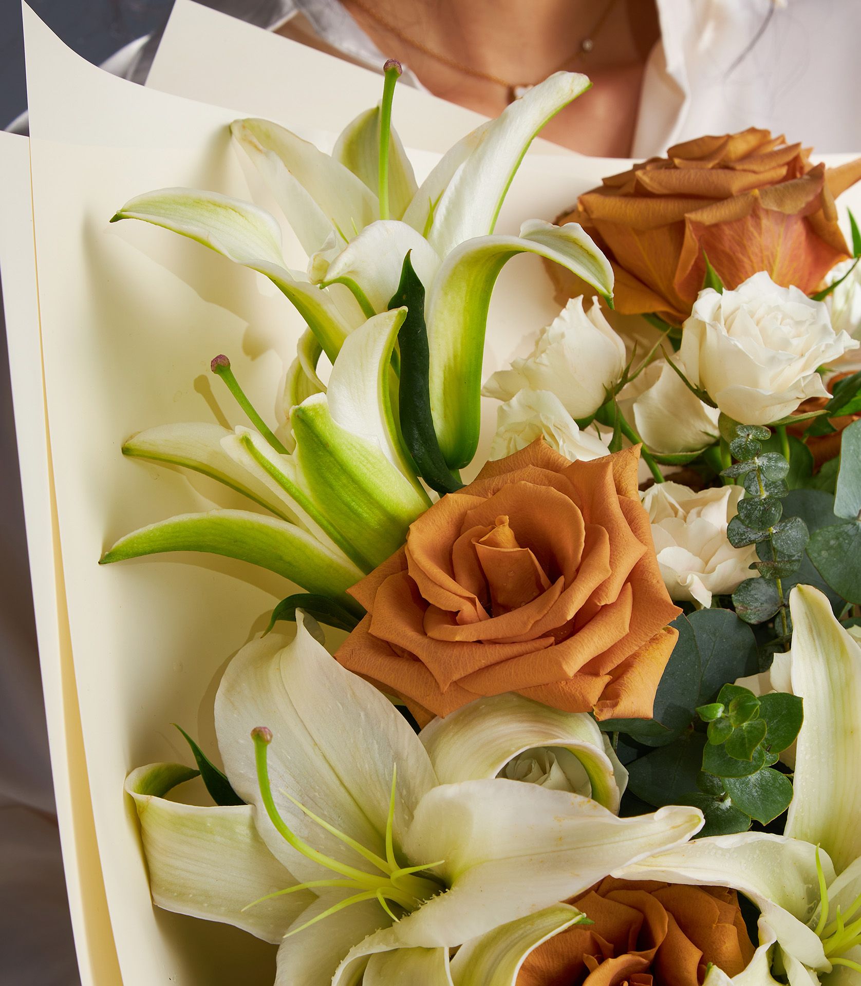 Luxury Lily and Rose Bouquet An elegant arrangement of Toffee roses, white lilies, and Majolica spray roses, perfect for heartfelt moments and graceful gestures.
