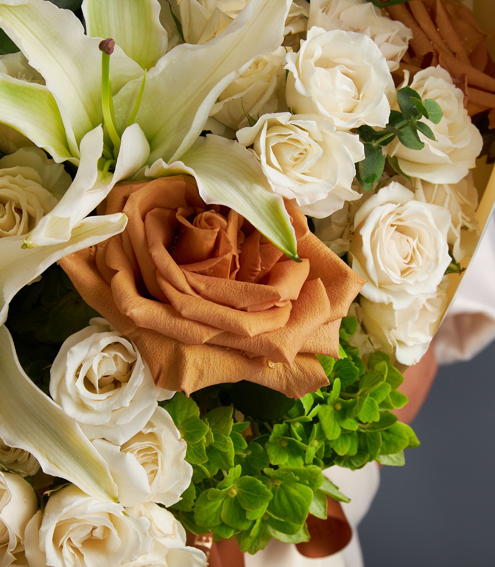 Sophisticated Toffee roses and white lilies, paired with Majolica spray roses, hydrangeas, and alstroemeria for timeless elegance.