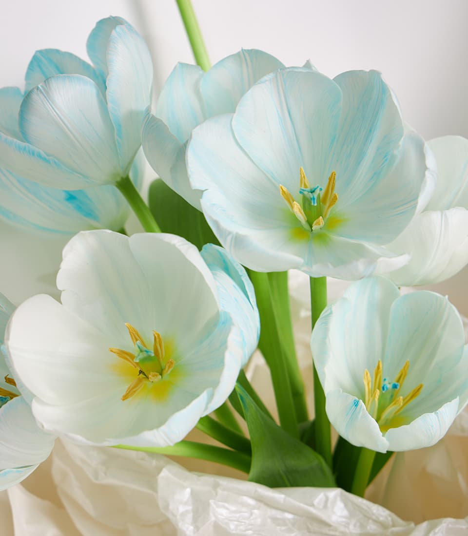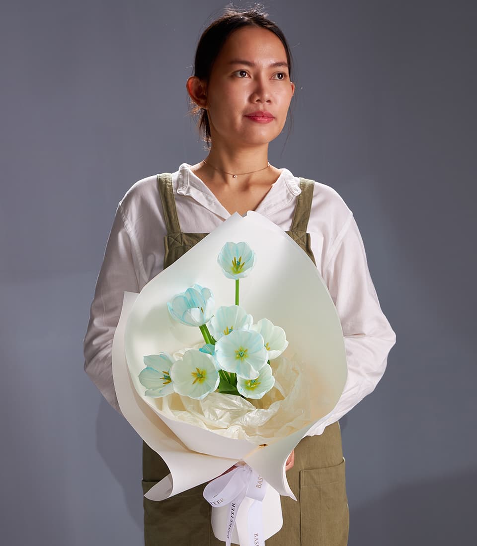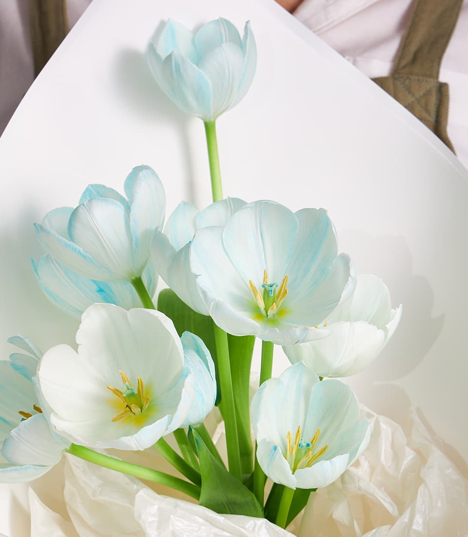 Minimalist bouquet of blue-white tulips, wrapped in crisp white paper. Perfect for birthdays, anniversaries, or elegant gift delivery in Bangkok.