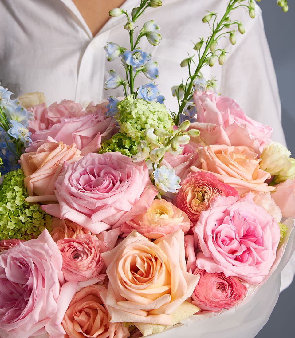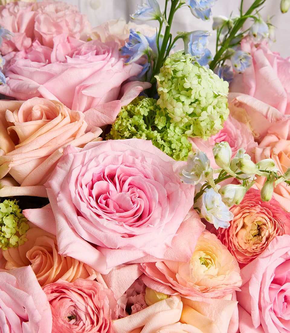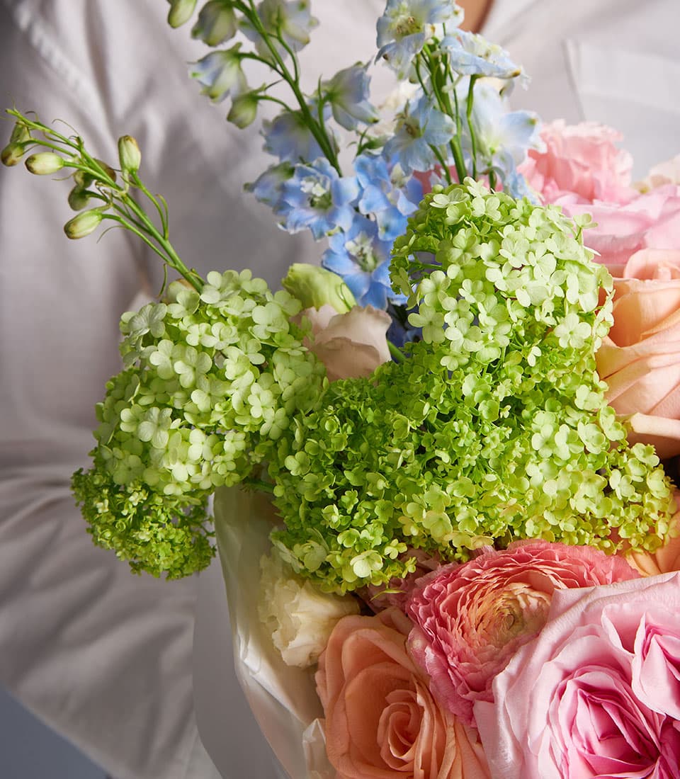 Luxurious bouquet of blush and peach roses with green hydrangeas and blue delphinium perfect for weddings anniversaries and luxury gifts