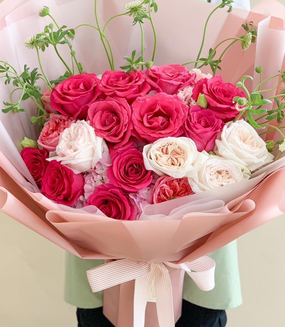 A charming bouquet of pink and white roses, beautifully wrapped for any romantic or special occasion. Show your affection with style.