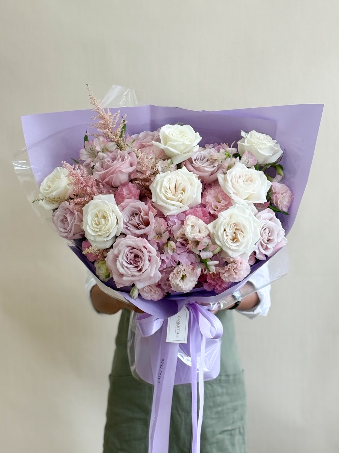 This elegant pastel bouquet blends Ecuadorian roses, hydrangeas, and seasonal blooms – perfect for a soft, romantic gesture.