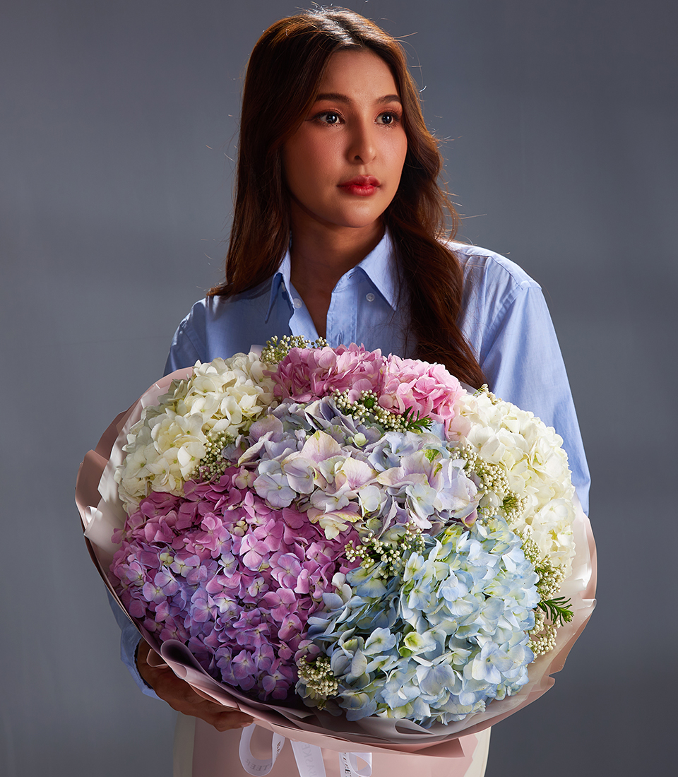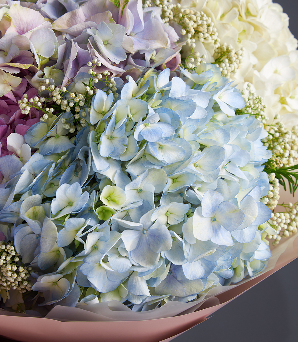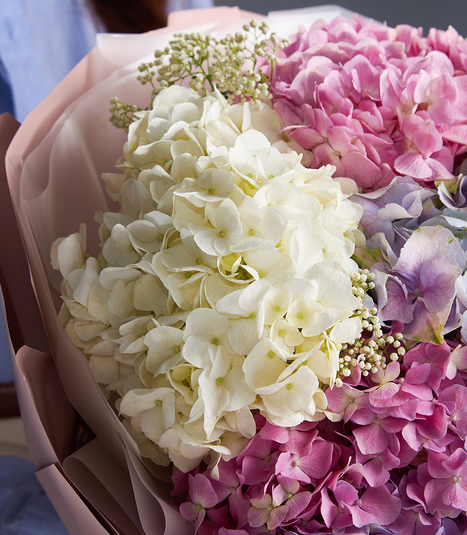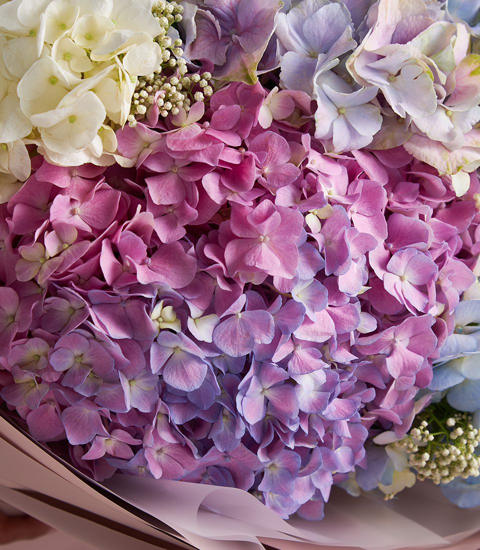 Elegant bouquet of pastel hydrangeas in pink blue lilac and white beautifully wrapped for luxury flower delivery in Bangkok