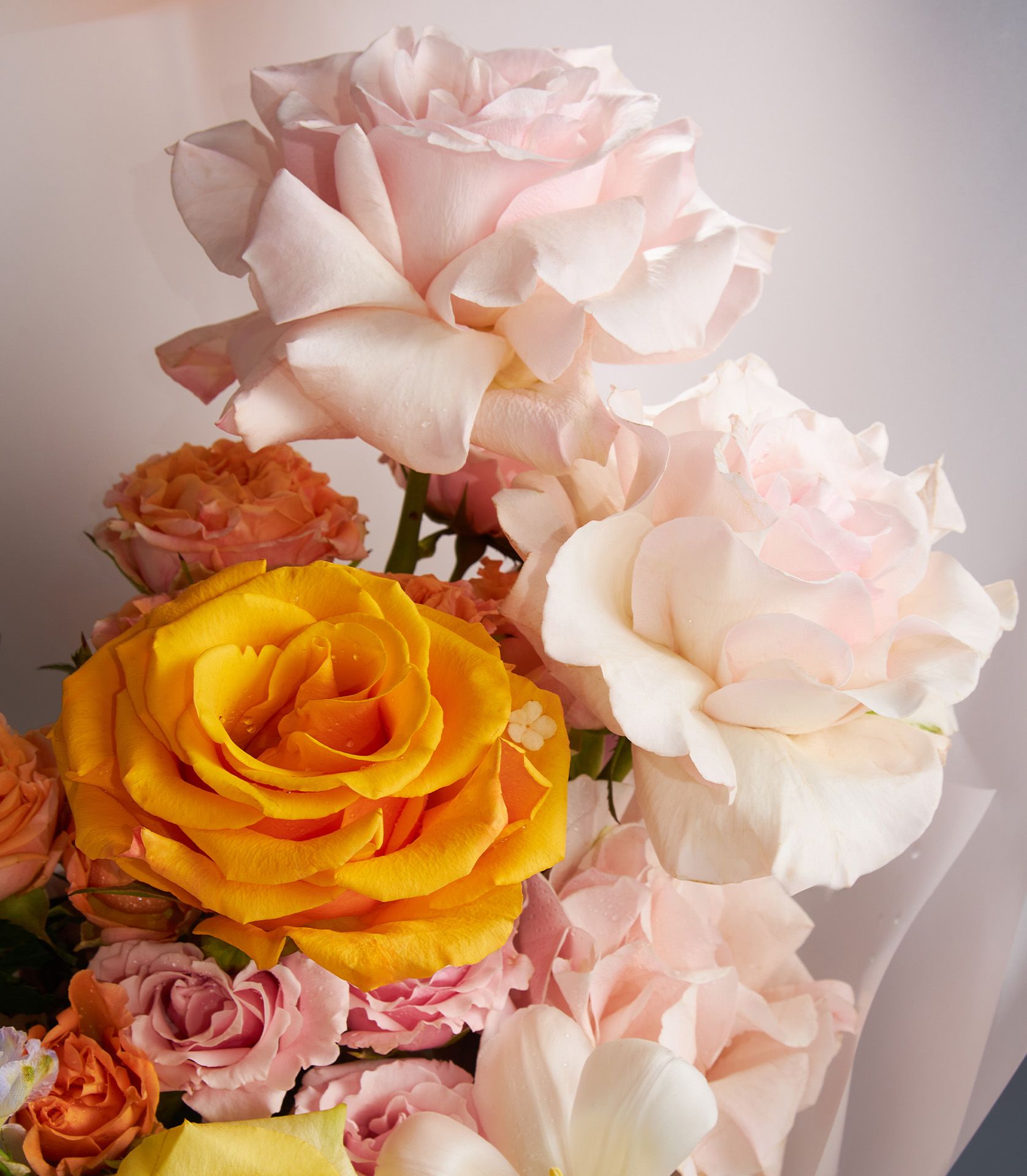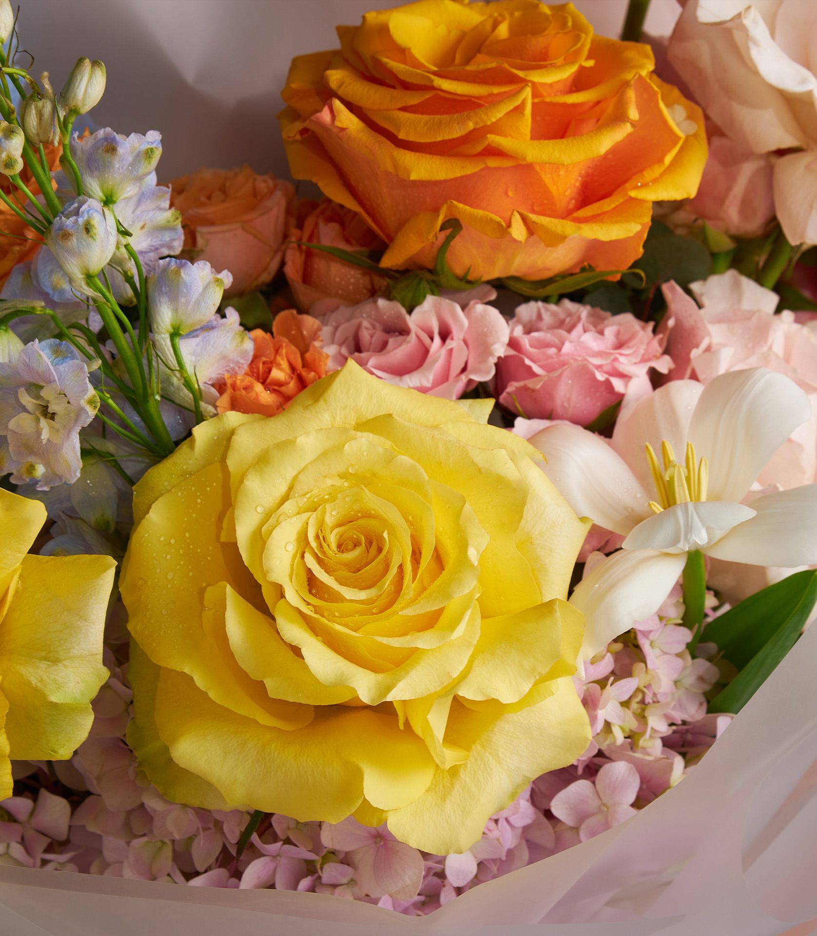 A stunning blend of golden yellow, warm orange, and blush roses, accented with tulips, hydrangeas, and vibrant delphinium.