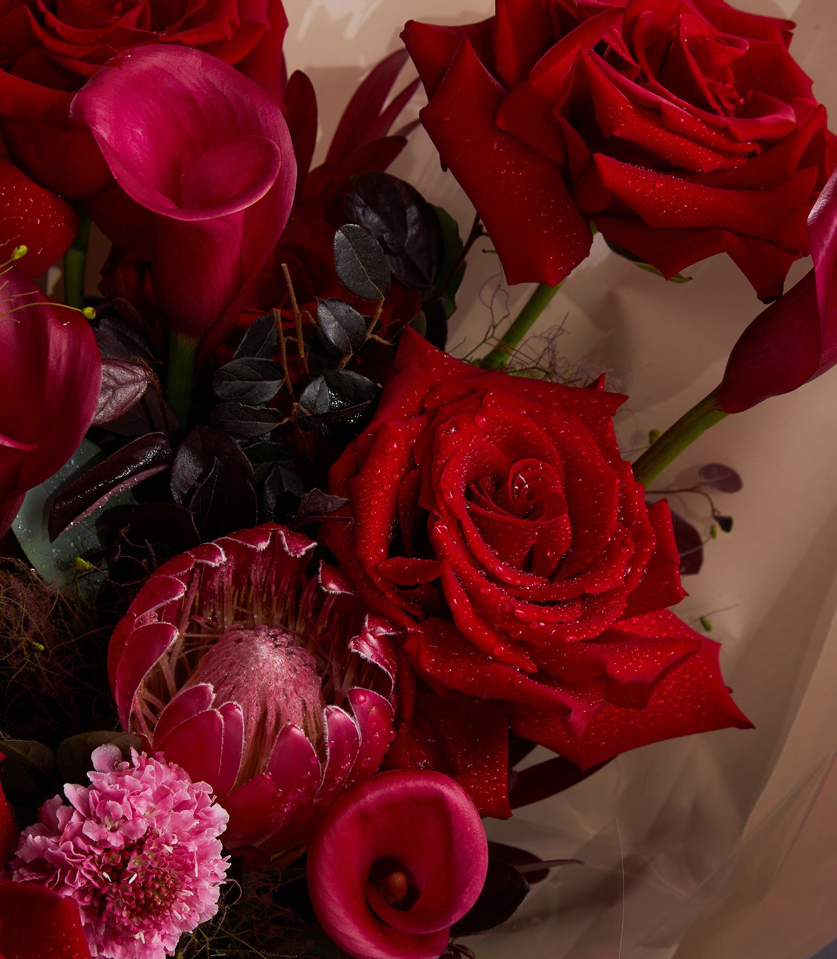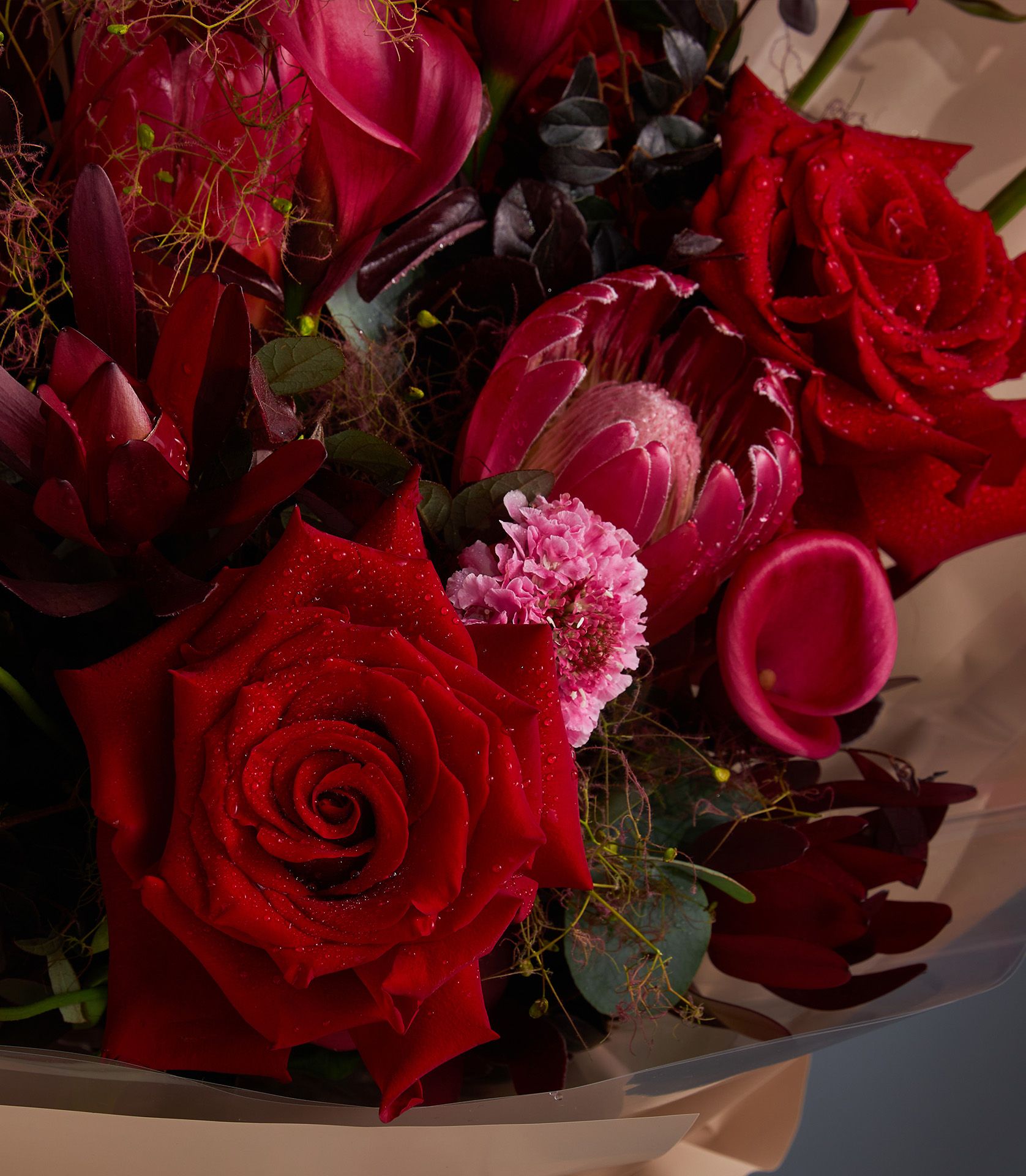 Stunning bouquet of Explorer roses, red protea, calla lilies, and scabiosa – perfect for passionate, luxurious celebrations.