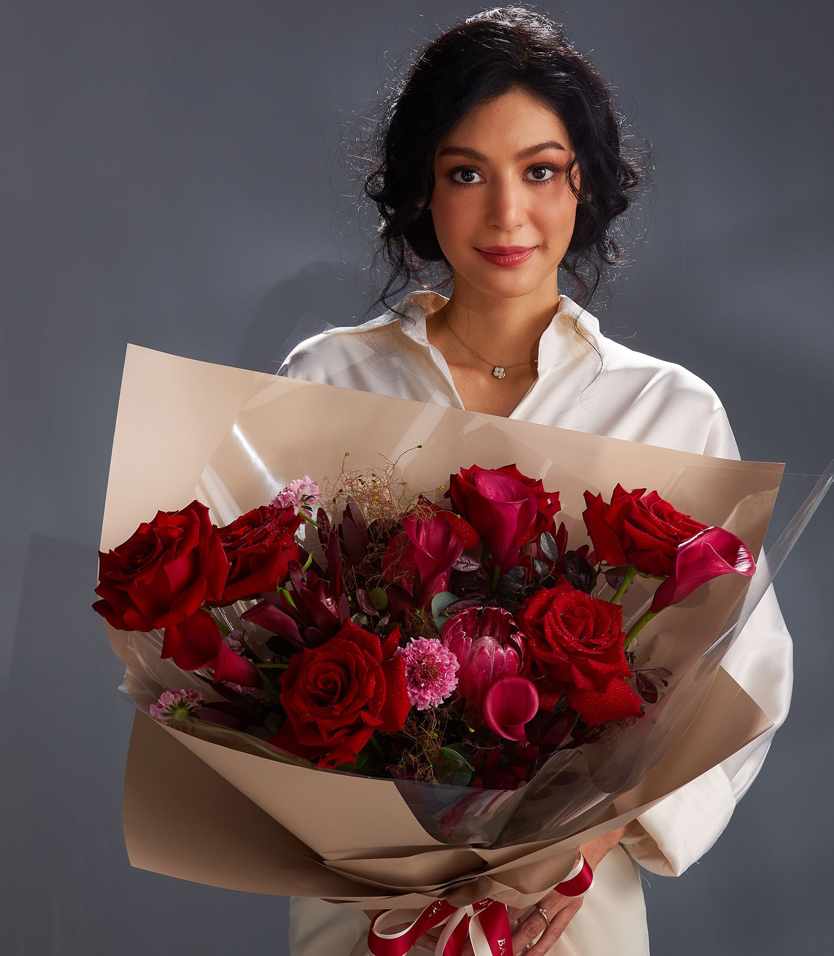Red Rose Gift Bouquet – Crimson Flame Unapologetically bold and romantic, this striking bouquet of Explorer roses, red lilies, and protea speaks of passion, luxury, and elegance.