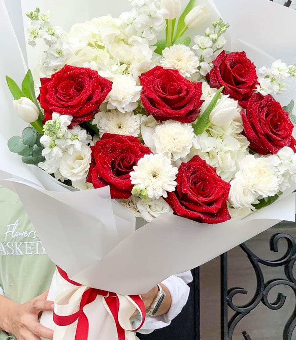 Romantic Embrace Bouquet This luxurious bouquet features a captivating blend of red roses and white flowers, symbolizing love, passion, and purity. It's the ideal gift for a special occasion or to express your deepest emotions.