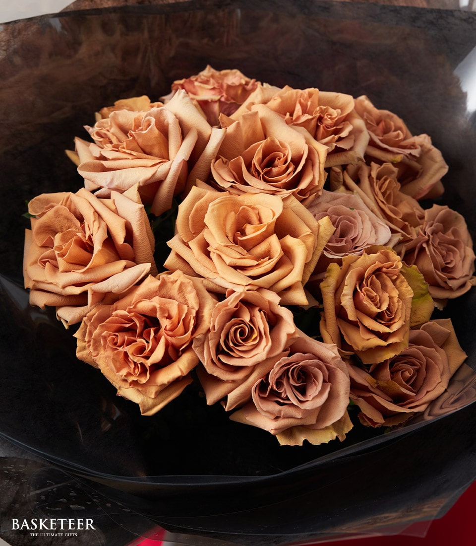 Indulge in the warm elegance of the Toffee Dream Rose Bouquet. A sophisticated floral arrangement perfect for gifting or decorating.