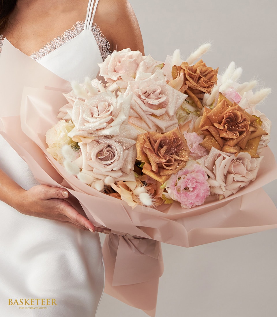A refined blend of champagne, blush, and warm nude roses, complemented by delicate white florals and soft textures, wrapped in elegant pastel pink.