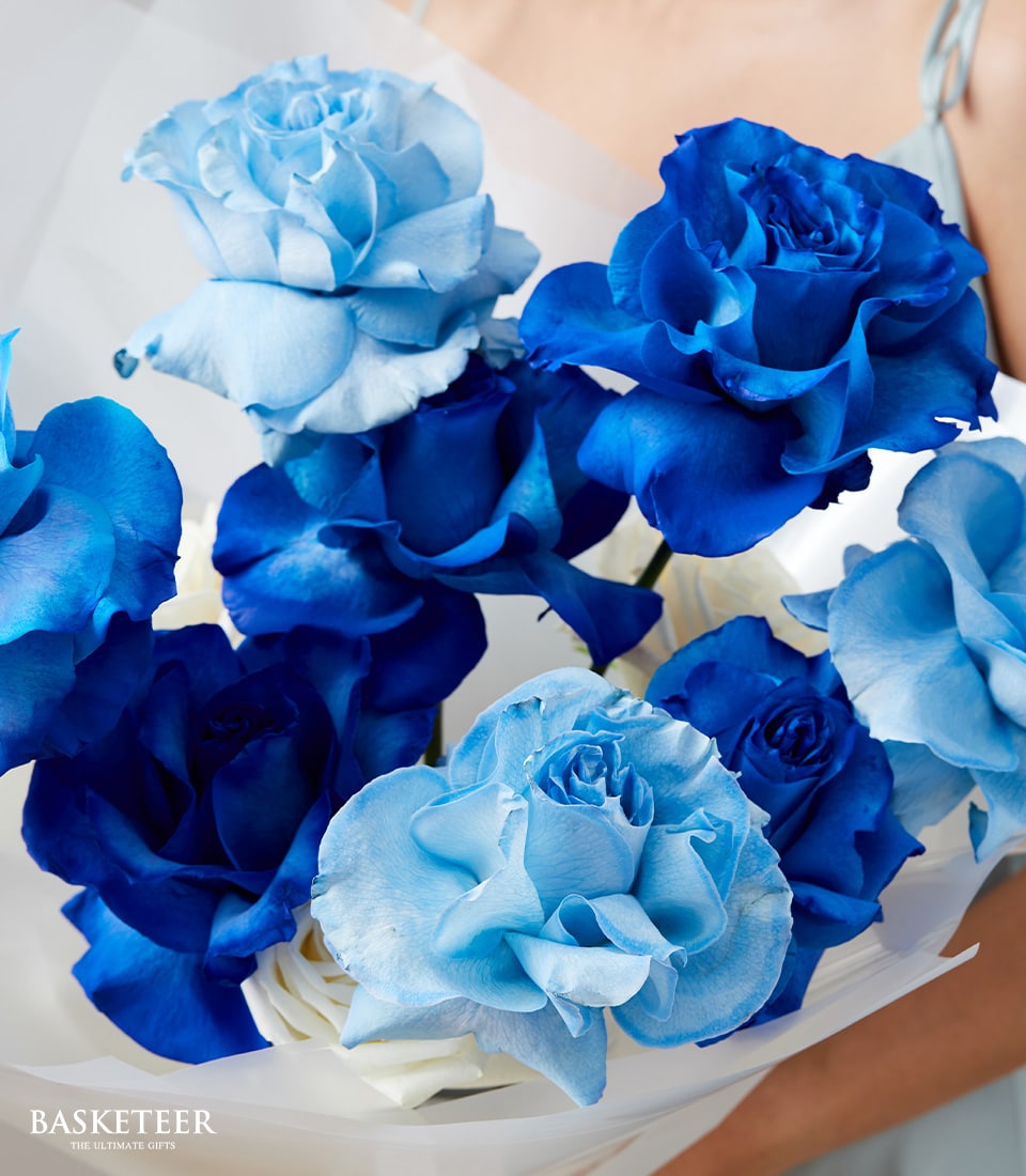 Elegant Blue Roses Bouquet Celebrate life's special moments with this elegant bouquet of blue roses, beautifully wrapped in white sheer paper. Ideal for anniversaries, milestones, or heartfelt surprises. These vibrant blooms deliver a message of sophistication and admiration.