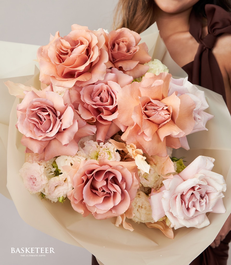A stunning bouquet of peach and mauve roses, inspired by a golden sunset. Perfect for anniversaries, birthdays, and special moments.