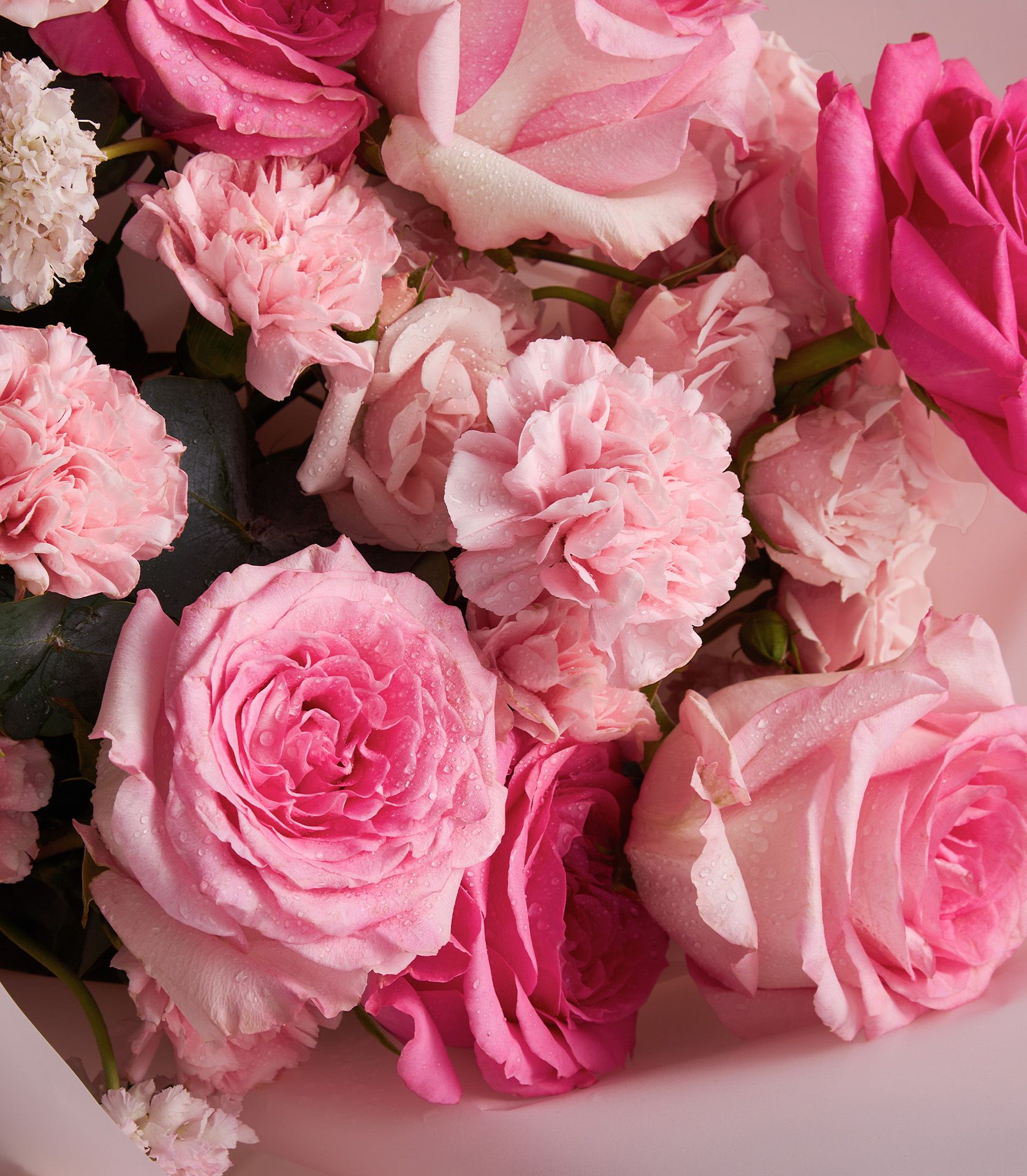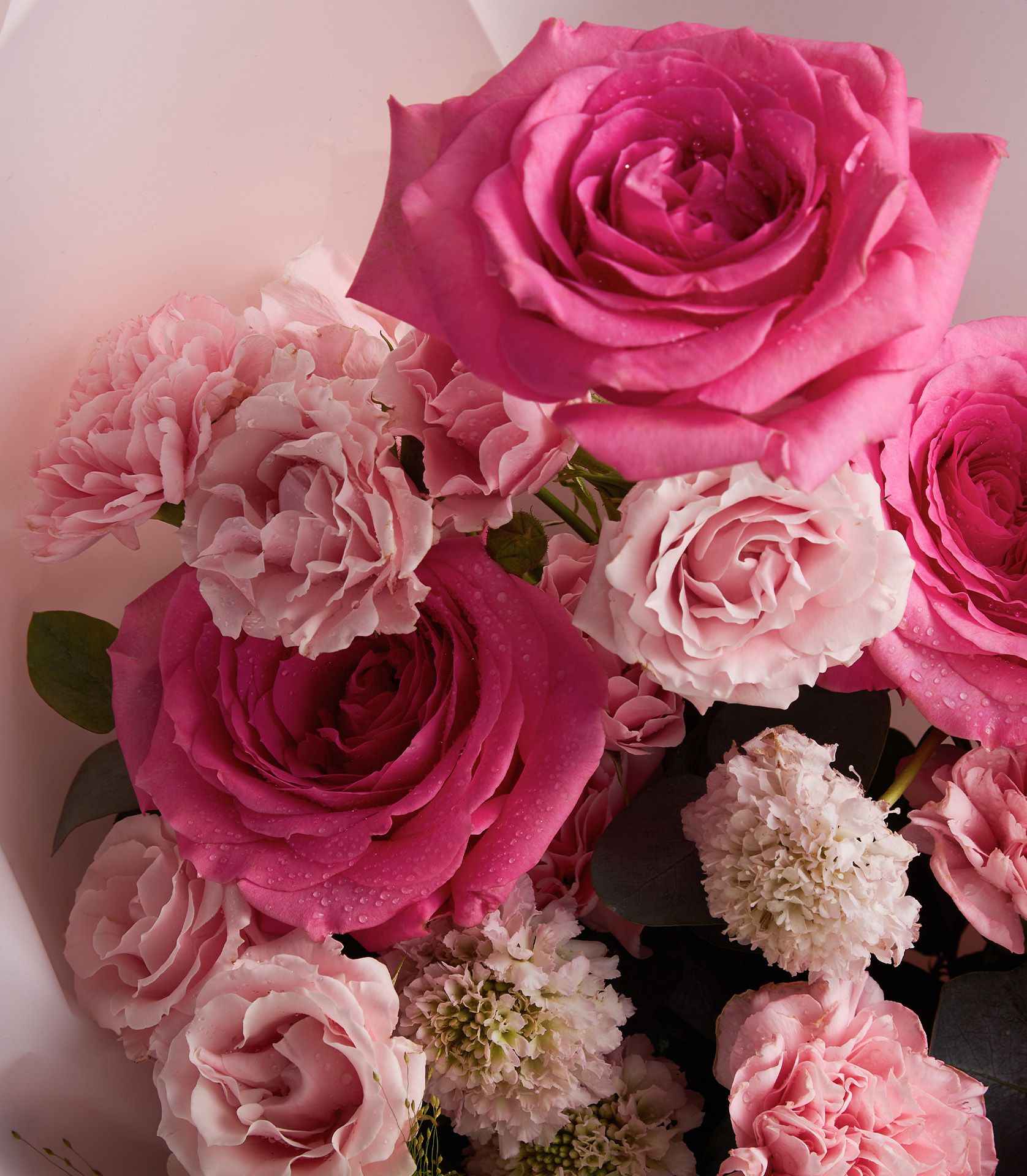 Nuage and Mandala roses paired with Majolica spray roses, pink carnations, and scabiosa create a bouquet full of elegance and charm.