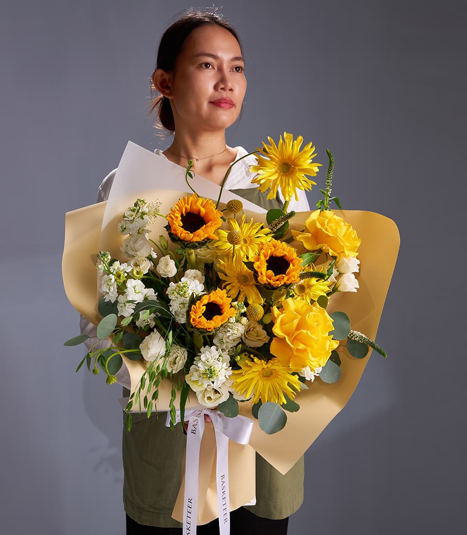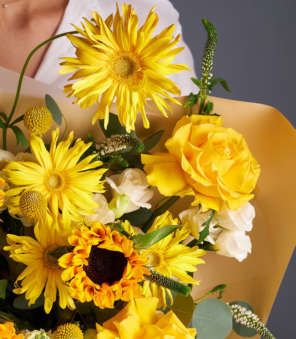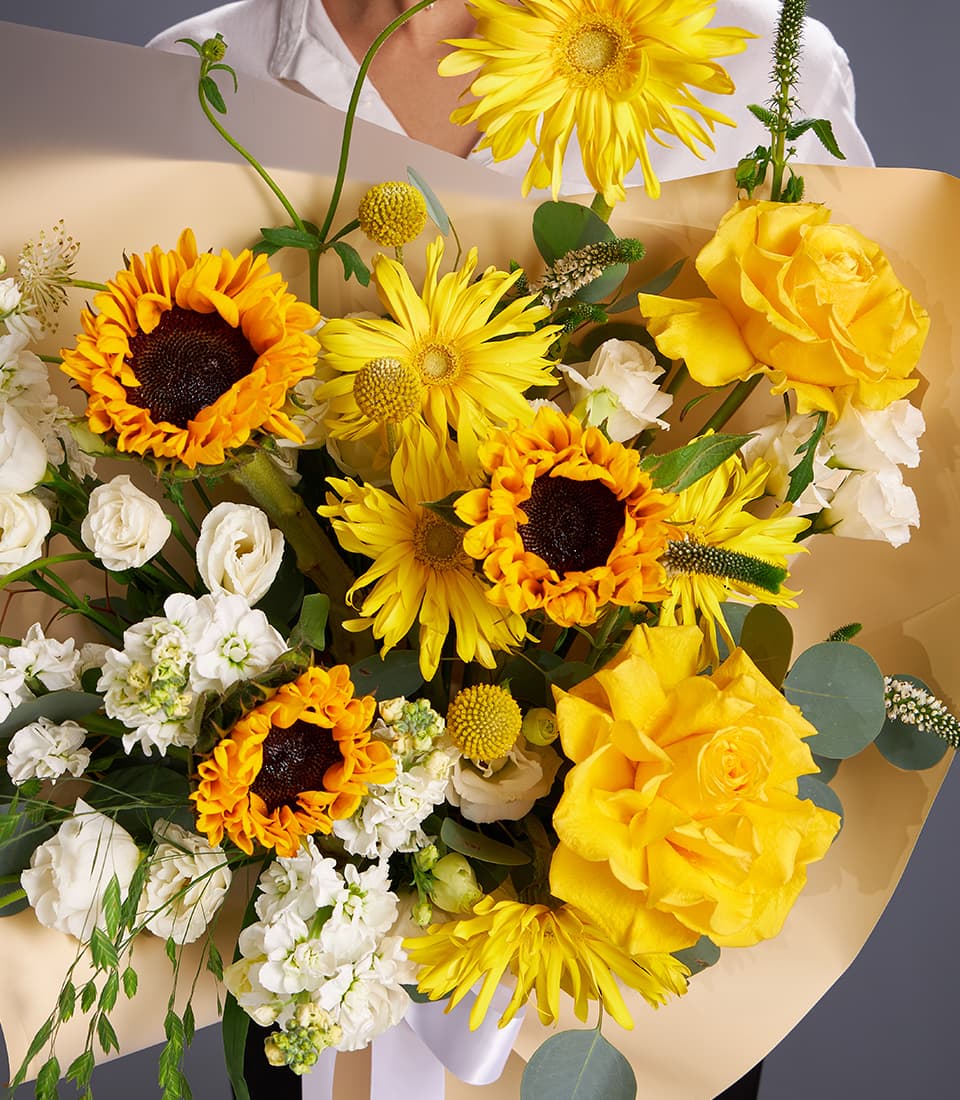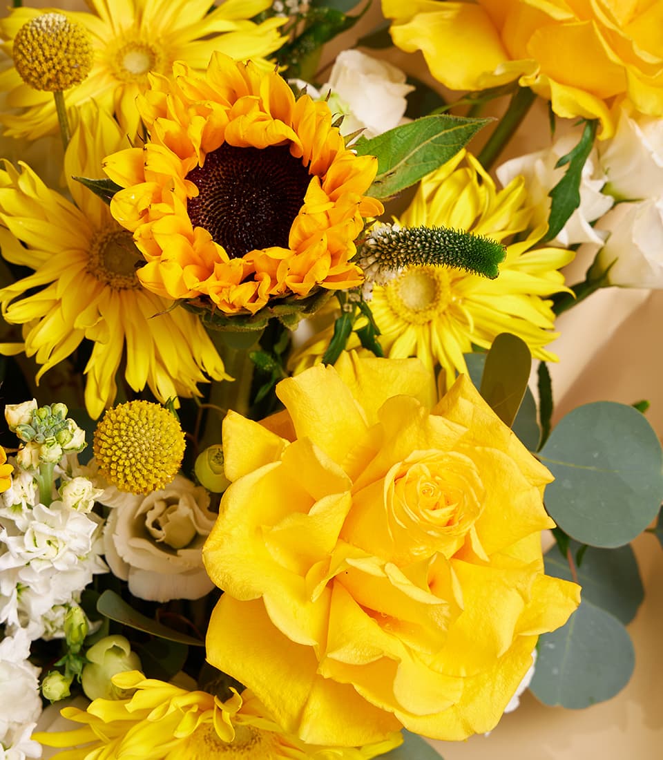Vibrant bouquet of sunflowers, yellow roses, and white blooms. A joyful and radiant gift perfect for birthdays, congratulations, or uplifting moments.