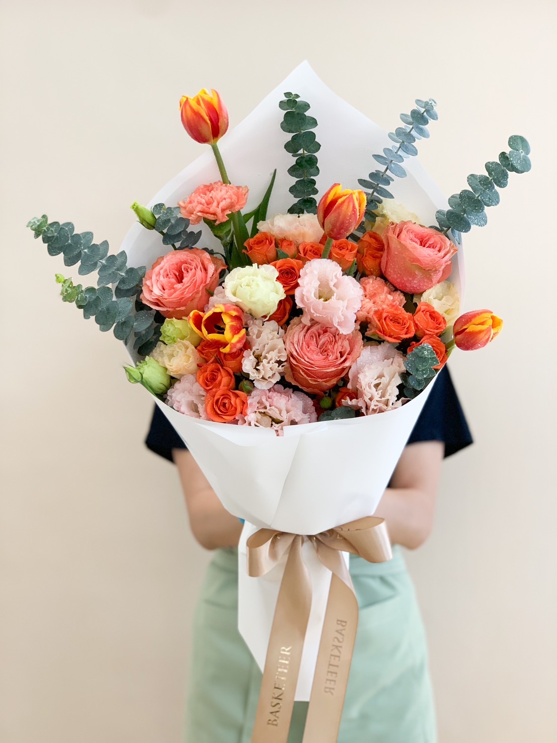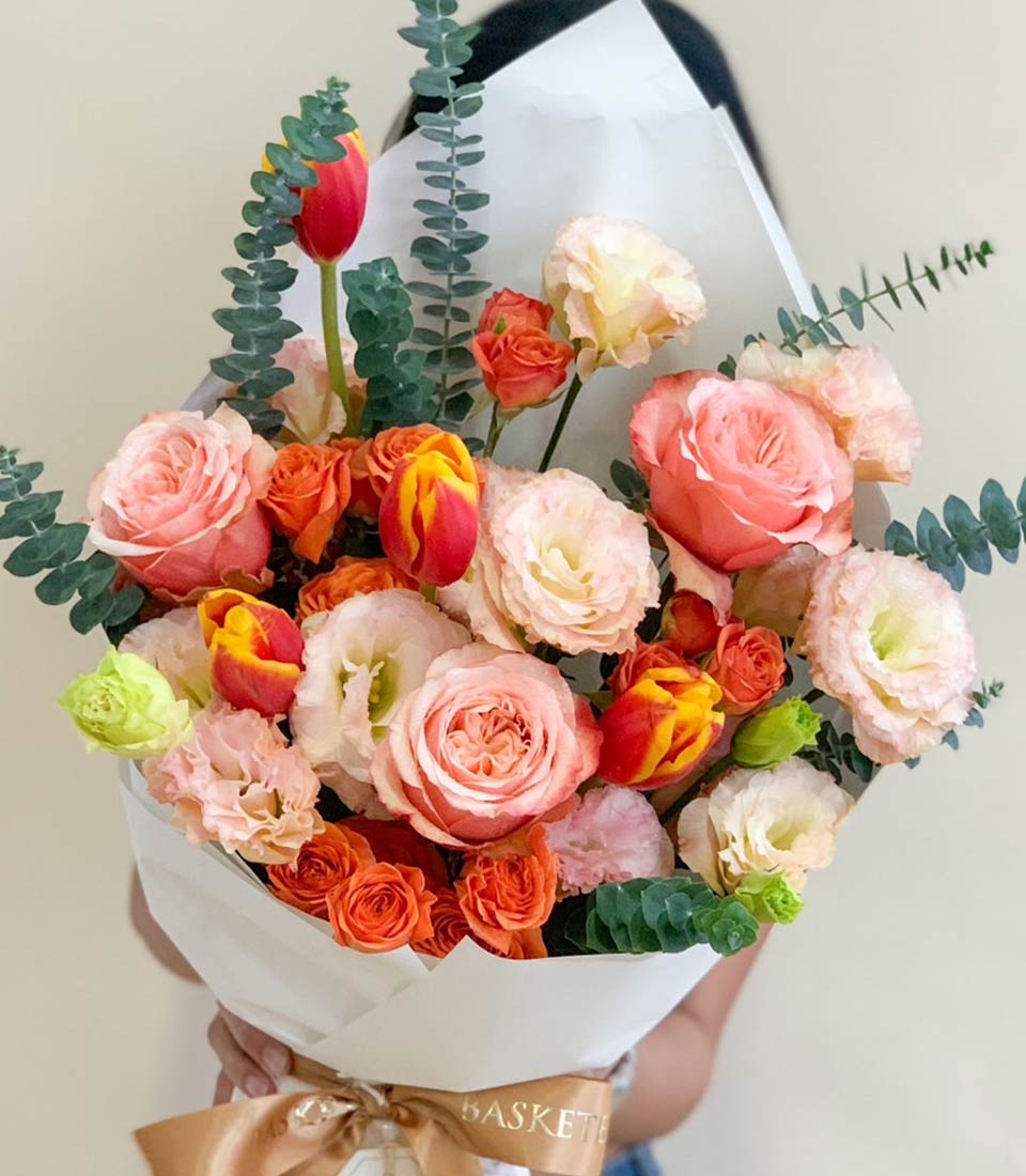 Vibrant Mixed Flowers Bouquet This stunning bouquet features pink roses, orange and yellow tulips, and fresh eucalyptus leaves, beautifully wrapped in white paper and tied with a brown ribbon. A perfect gift to brighten any occasion with its vibrant colors and natural elegance.
