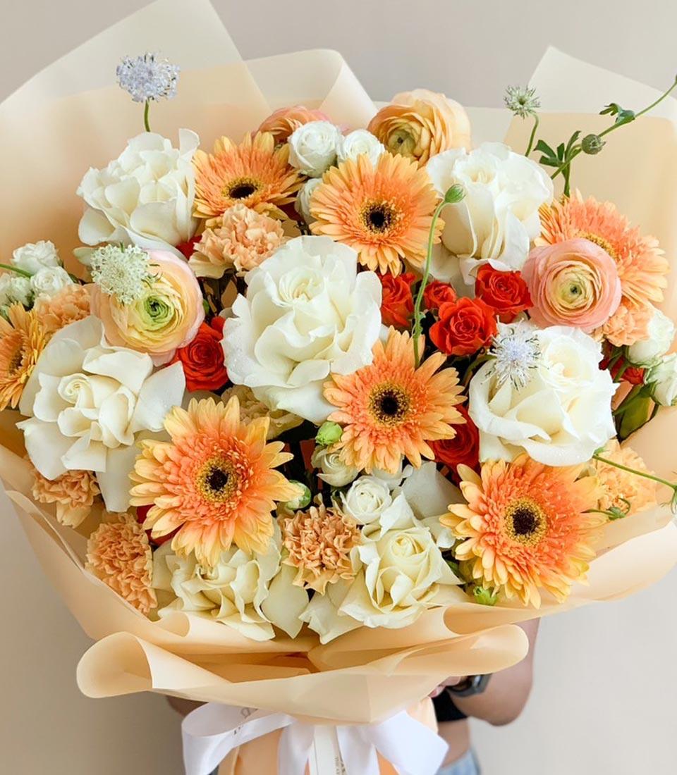 An elegant bouquet of peach and cream roses mixed with soft gerberas and fresh flowers, perfect for any occasion.