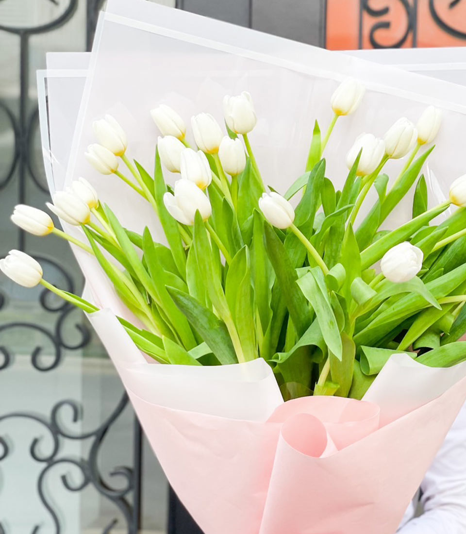 White Tulip Bouquet in Pink Wrapping Elegant and pristine, our White Tulip Bouquet in Pink Wrapping features a stunning collection of fresh white tulips, beautifully arranged and wrapped in soft pink paper. Perfect for any occasion, this bouquet exudes sophistication and charm, making it an ideal gift to express purity, grace, and admiration.
