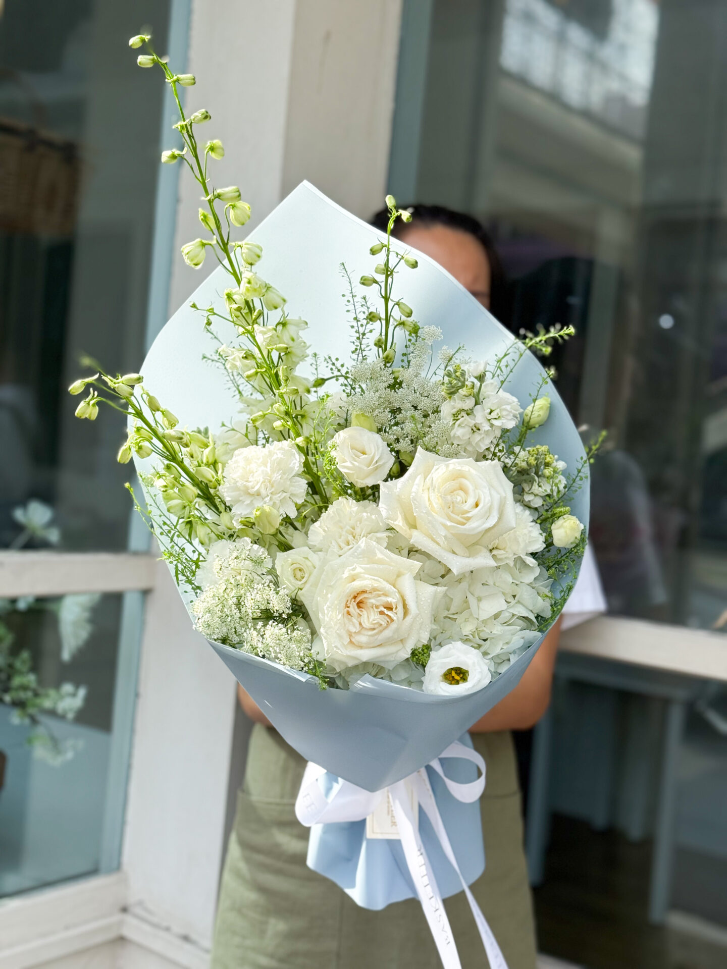 White Flower Bouquet – Winter Bloom A graceful bouquet of Playa Blanca roses, white stock, and delphinium, blending purity and elegance for refined floral gifting moments.