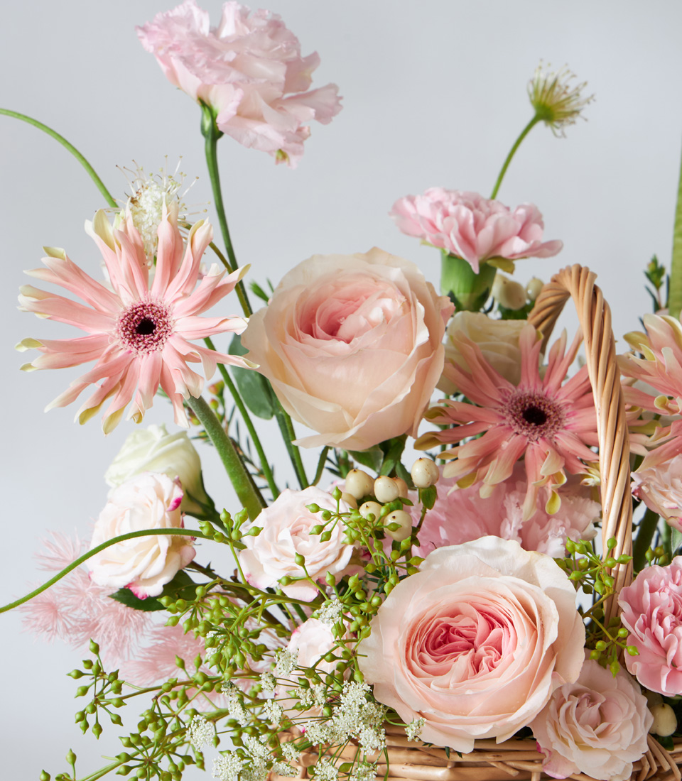 Pastel basket of pink roses gerberas carnations and lisianthus beautifully arranged for premium flower delivery in Bangkok