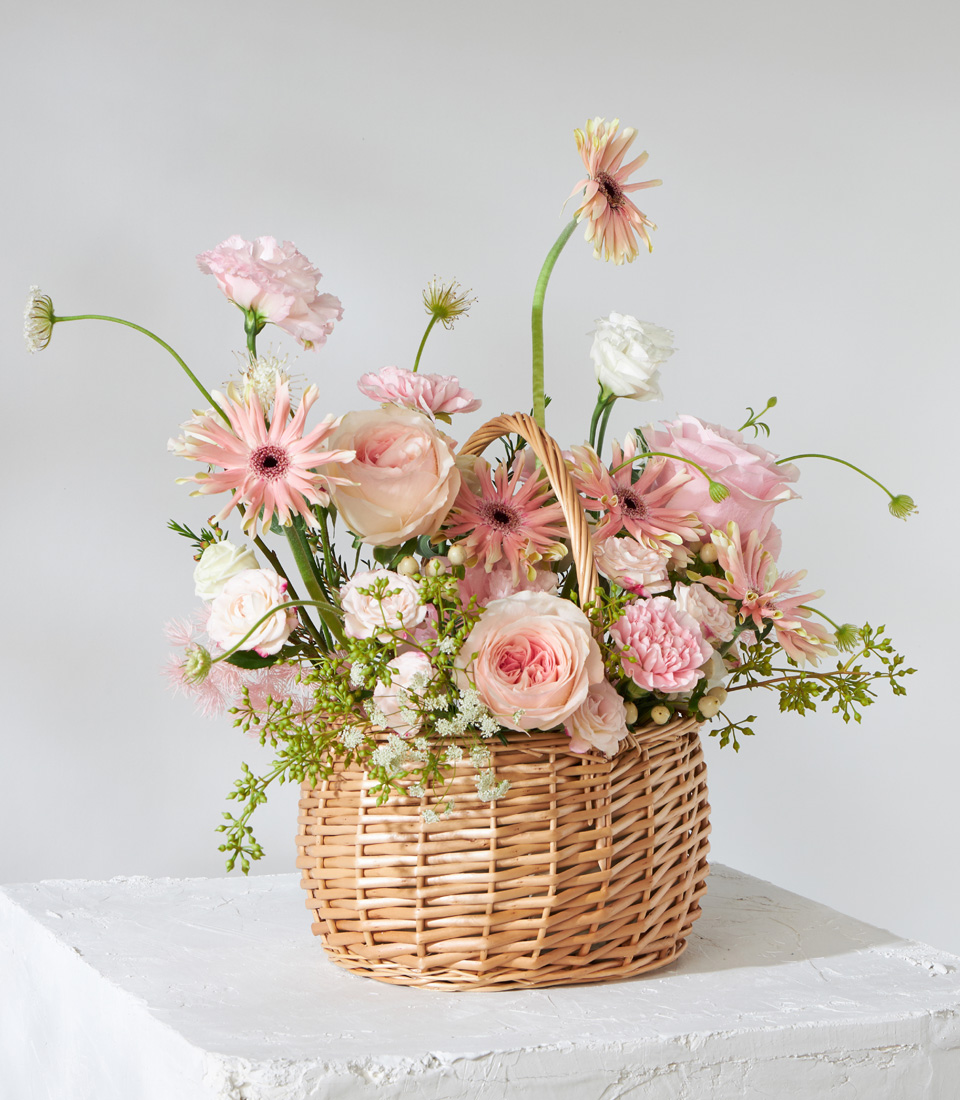 Medium size basket arrangement, styled in a soft free-flowing design with a romantic and feminine touch.