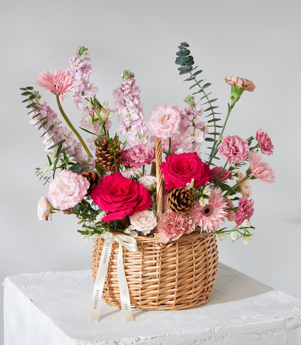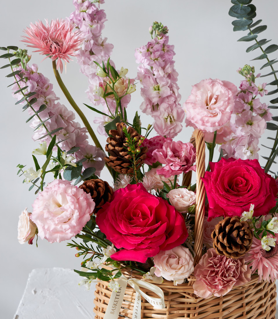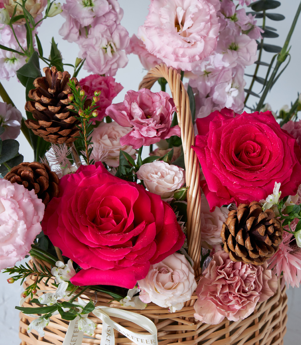 Charming basket of red roses pink carnations chrysanthemums and pinecones beautifully arranged for premium flower delivery in Bangkok