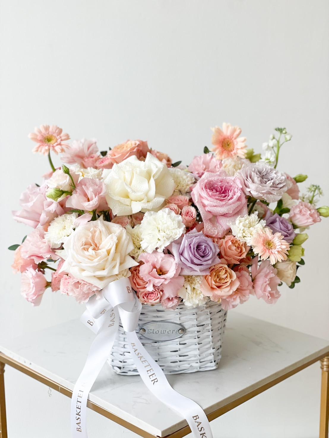 Gentle Unfolding Flowers Gift Basket Delightfully arranged in a classic white wicker basket, this pastel-themed flower arrangement features a harmonious blend of roses, hydrangeas, lisianthus, gerberas, and seasonal blooms. The soft pinks, purples, creams, and whites make this a perfect gift for birthdays, get-well wishes, housewarmings, or simply to spread joy and beauty.