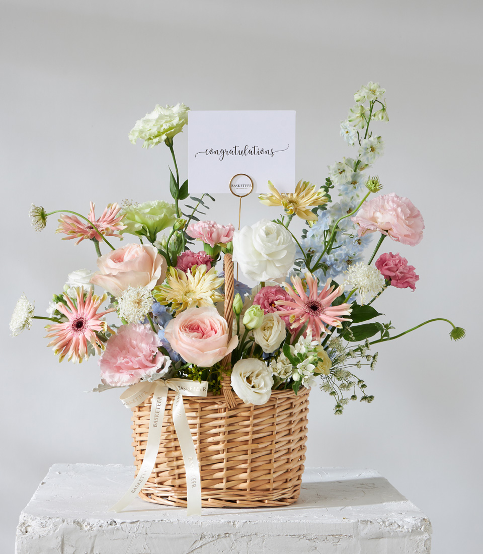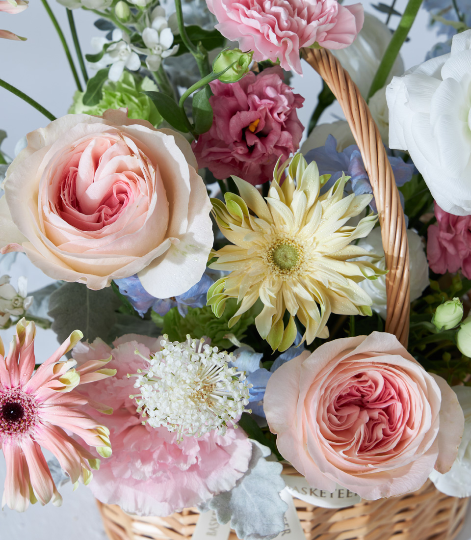 Pastel Bloom Flower Basket A delicate basket with Pink Cloud Roses in pastel pink, paired with seasonal flowers in soft hues to create romance and gentle elegance.