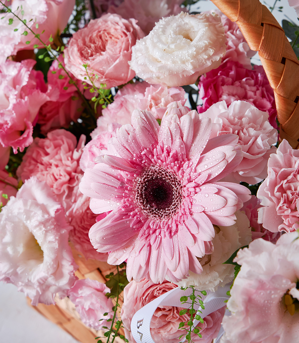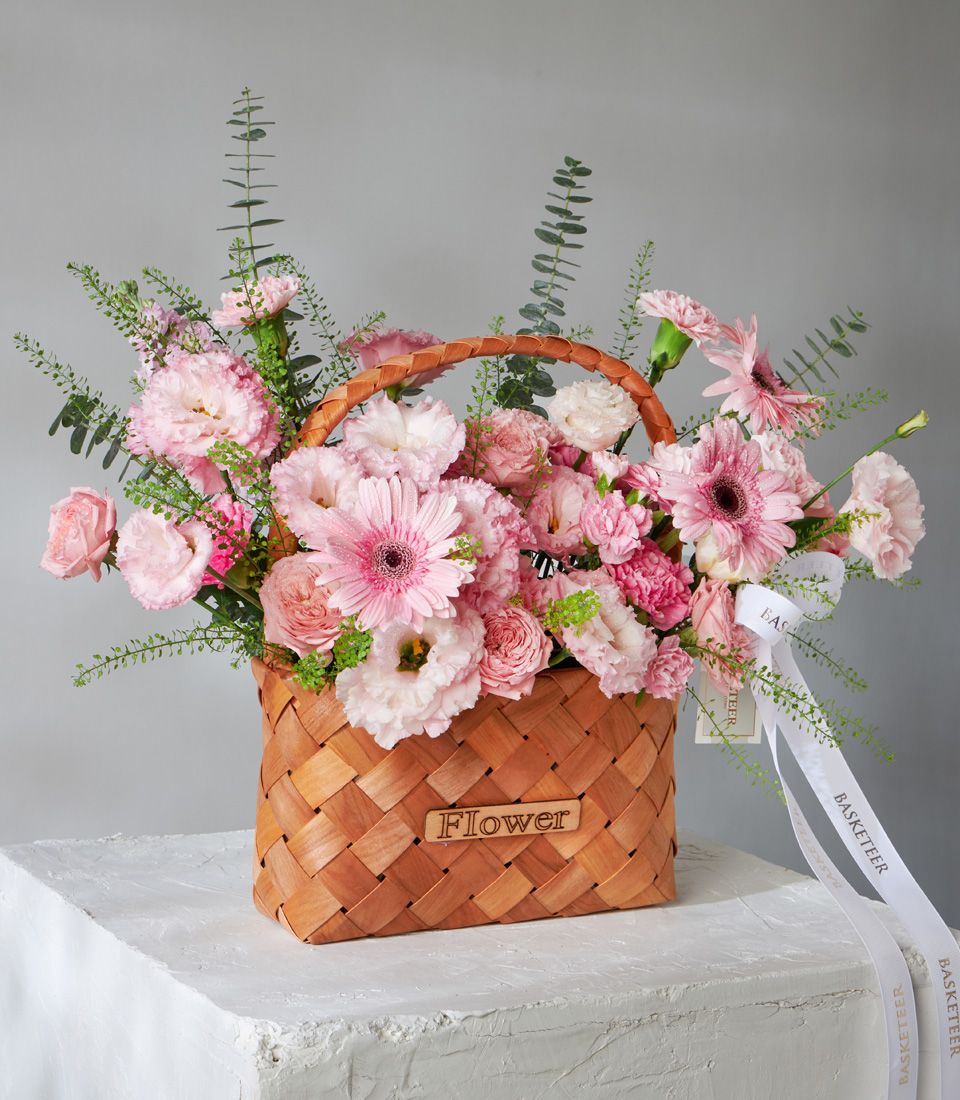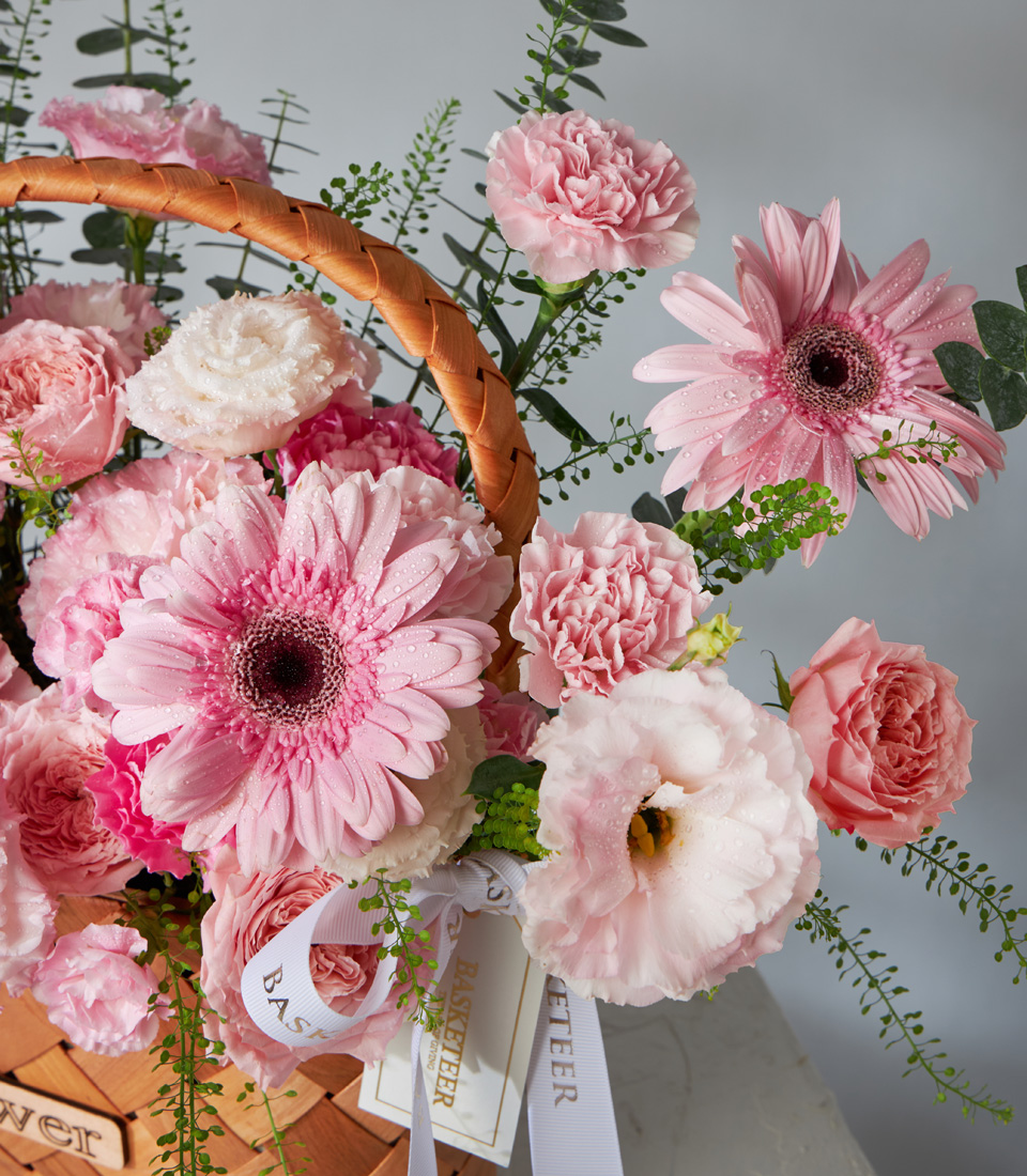 Charming basket of pink roses carnations gerberas and lisianthus beautifully arranged for luxury flower delivery in Bangkok.