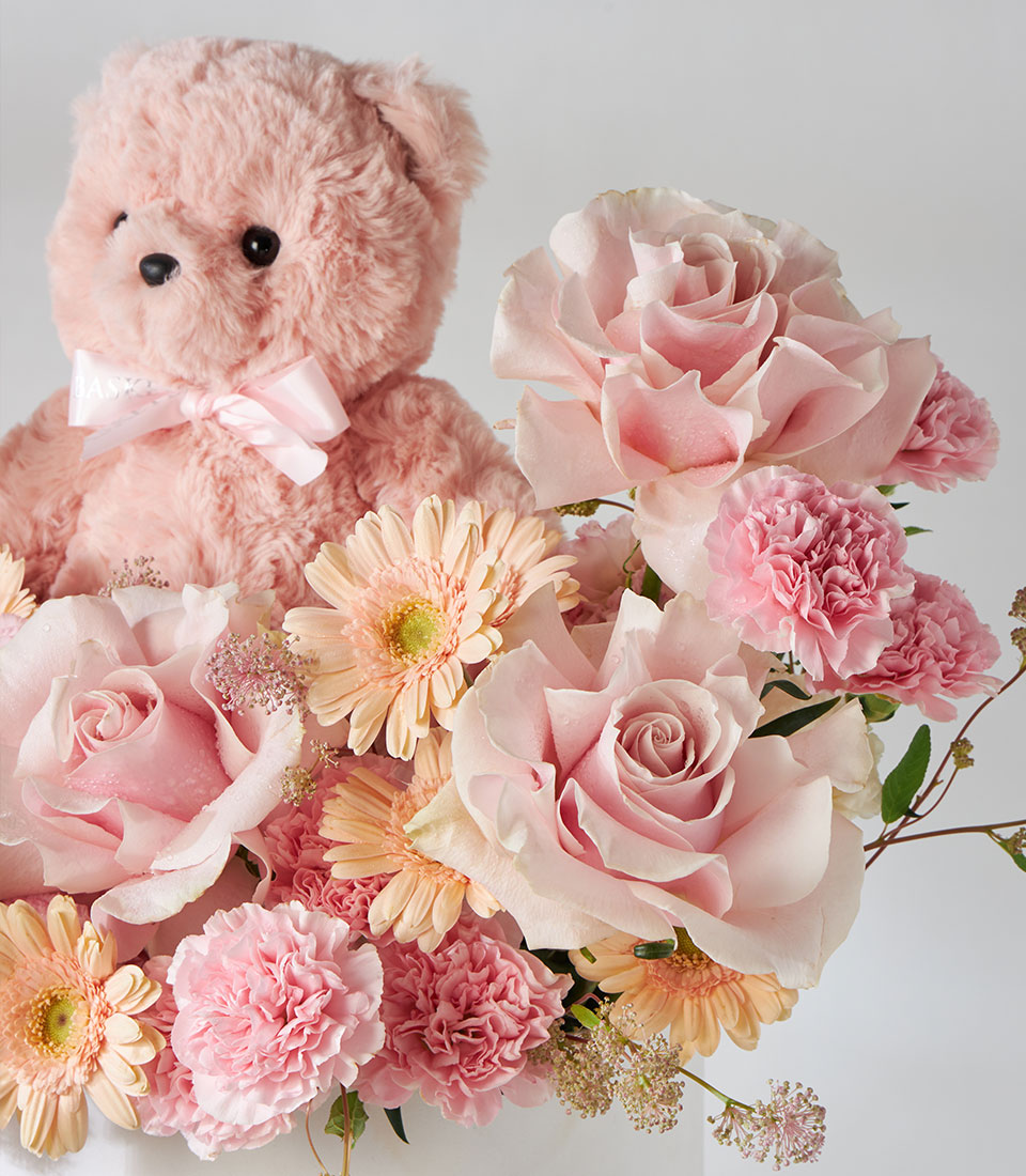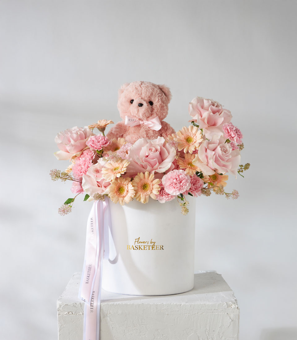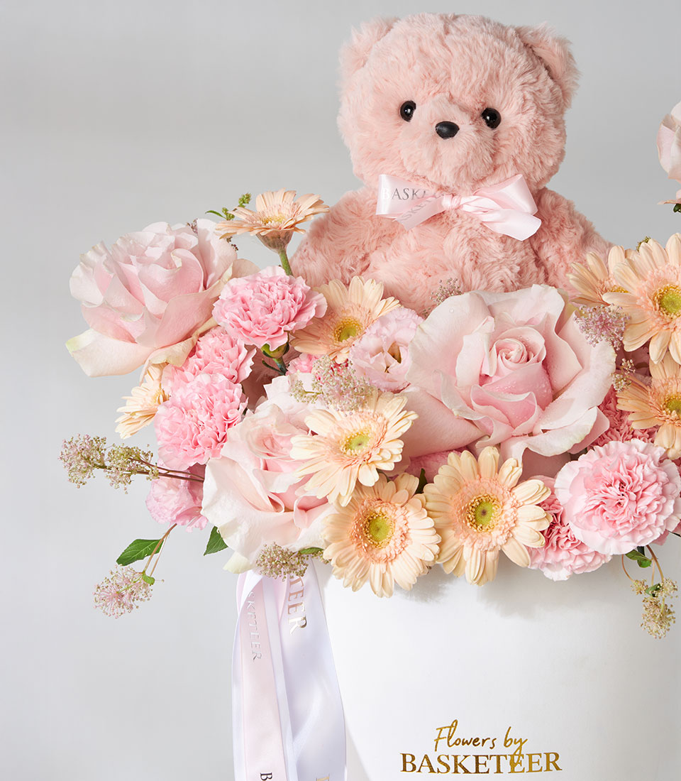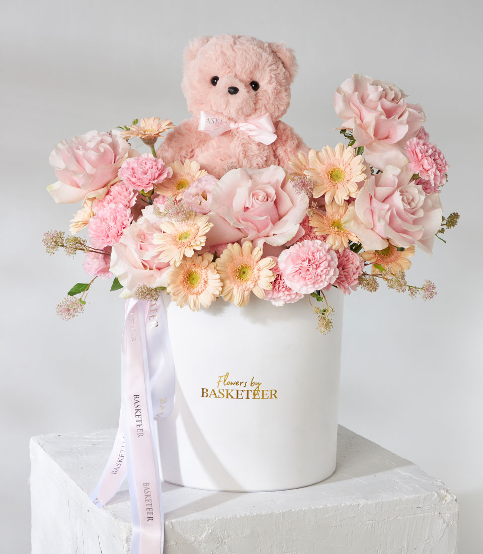 Sweet pink flower box featuring premium Pink Mondial roses imported from Ecuador, decorated with pastel blooms and a blush teddy bear—crafted in a white leather box with satin ribbon. Perfect for gifting and same-day delivery in Bangkok.