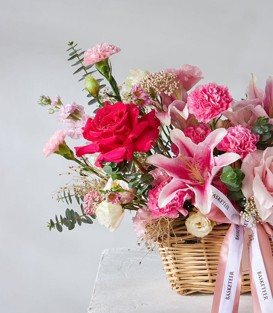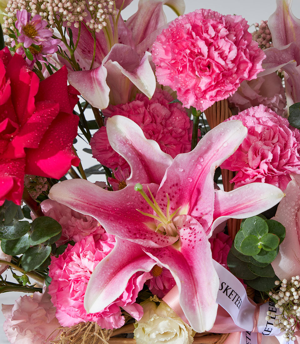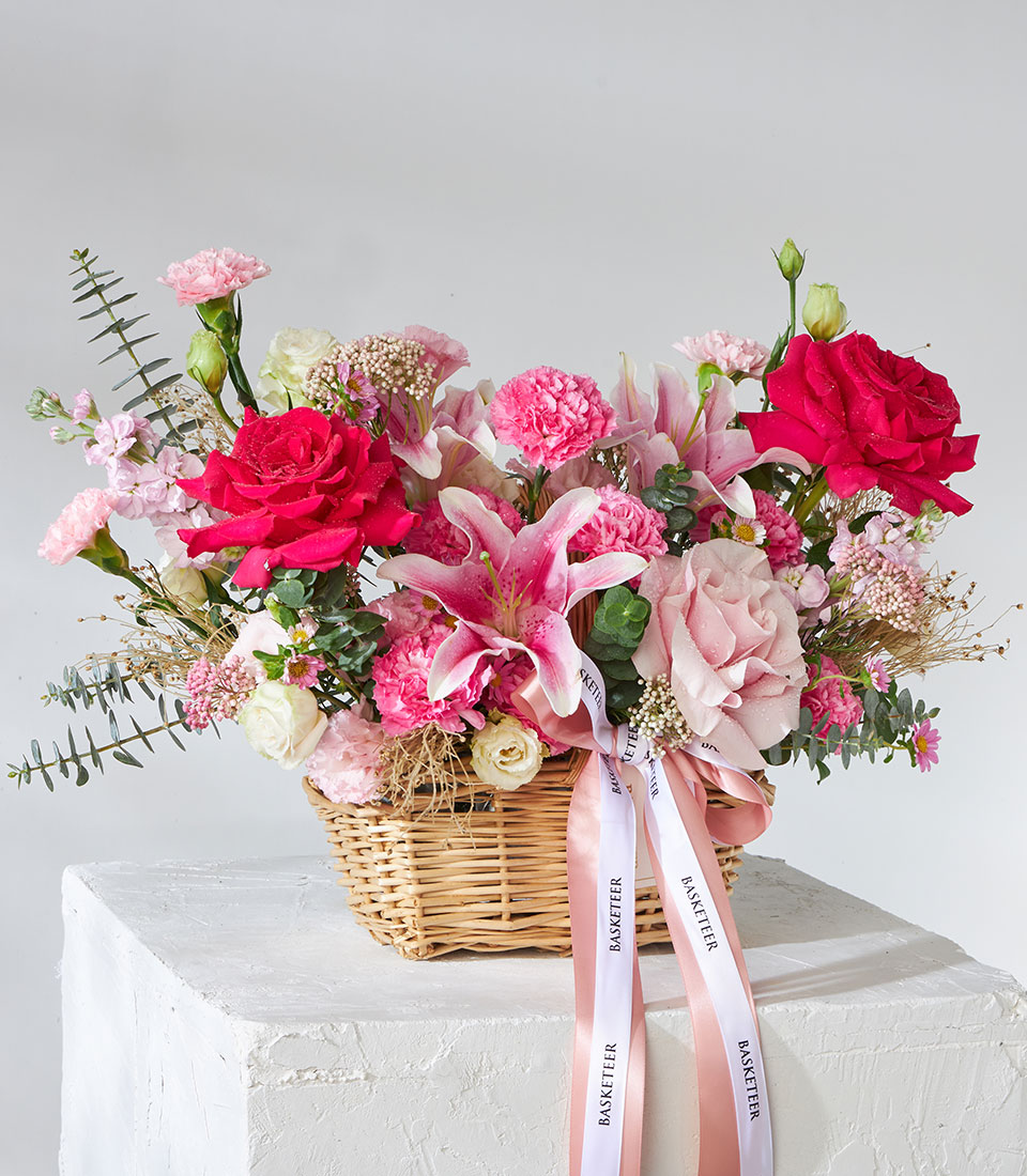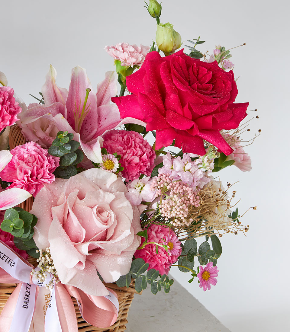 Enchanting Pink Mondial Harmony Gift Basket Delight in the charm of our Enchanting Pink Mondial Harmony Gift Basket featuring a stunning array of fresh pink flowers. This elegant gift basket is perfect for any occasion, offering a harmonious blend of beauty and grace. Ideal for celebrating special moments or brightening someone's day with a touch of floral elegance.