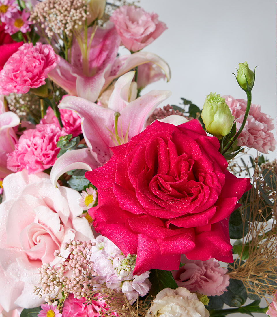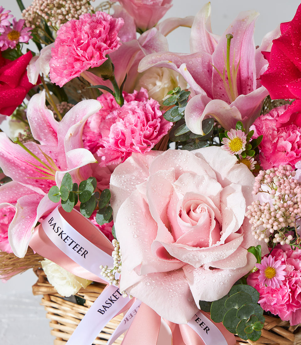 Discover the beauty of our Enchanting Pink Mondial Harmony Gift Basket, featuring fresh pink blooms arranged in a stunning display.
