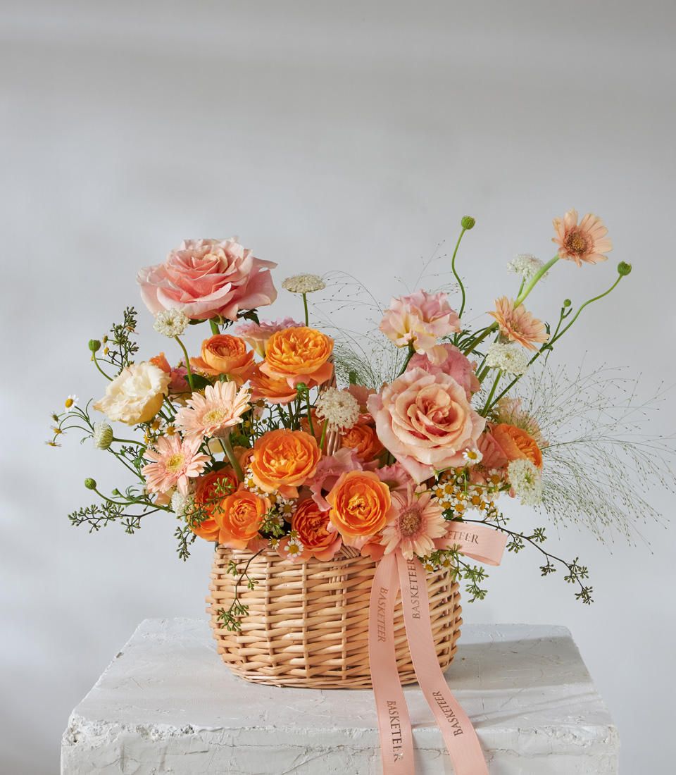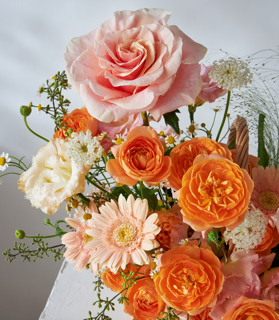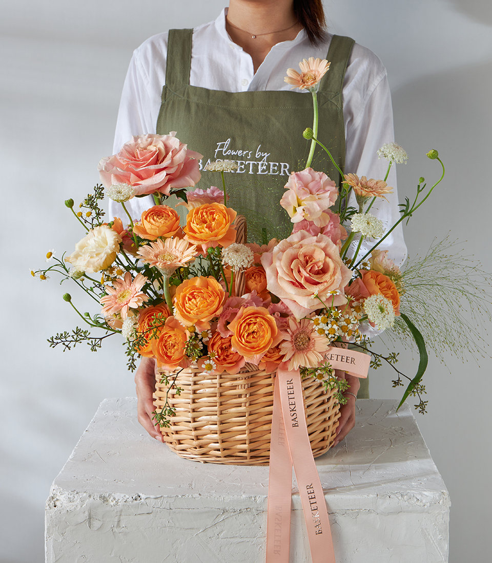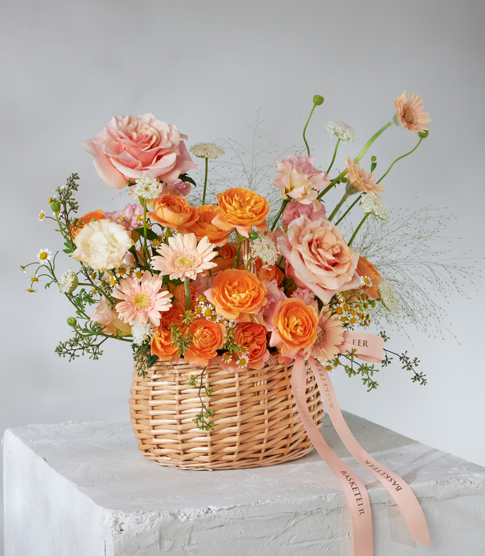 Vibrant basket of orange roses peach gerberas and seasonal blooms beautifully arranged for premium flower delivery in Bangkok