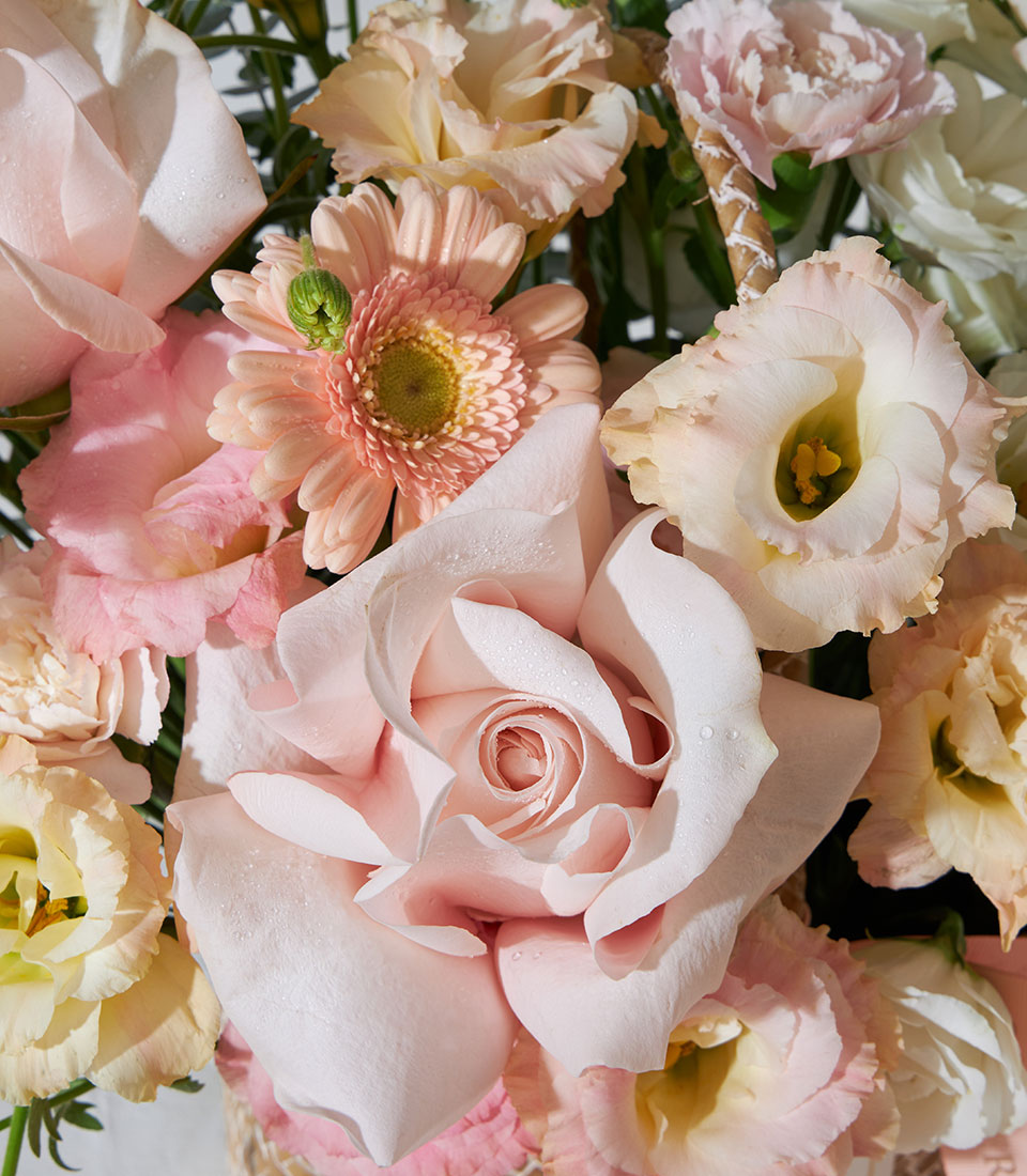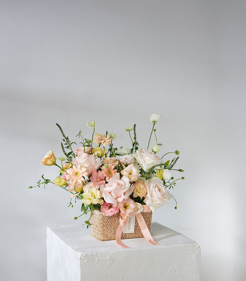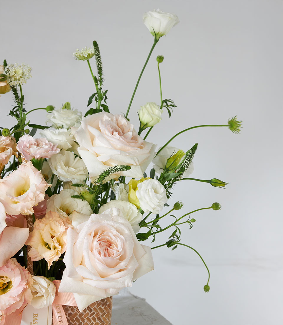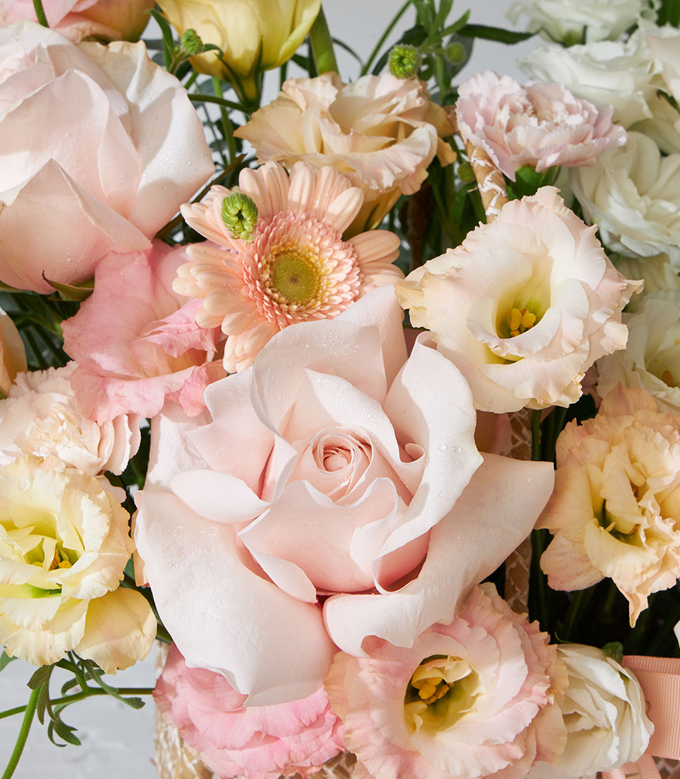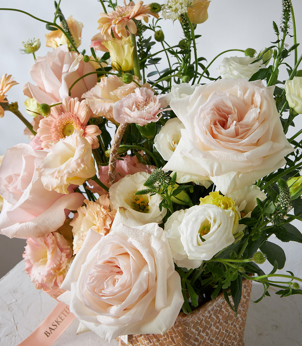 Pastel flower basket featuring exclusive White O’Hara and Pink Mondial roses from Ecuador, arranged with lisianthus, gerbera, and delicate fillers. Presented in a natural woven basket with Basketeer ribbon — elegant and perfect for every occasion.