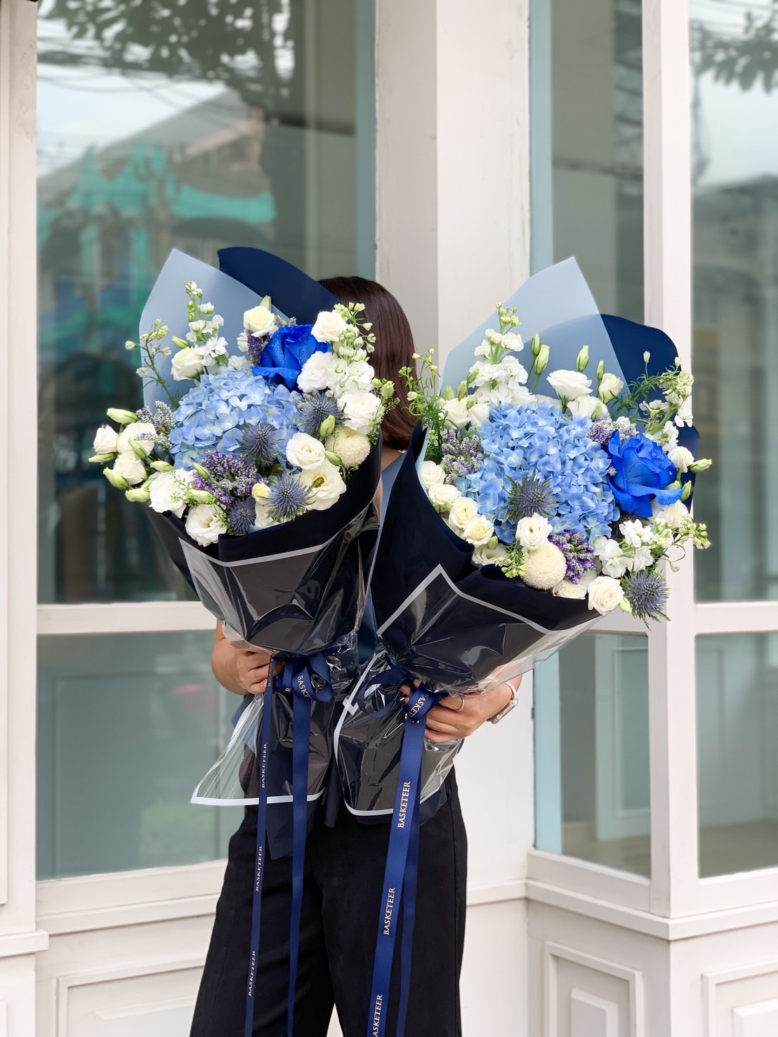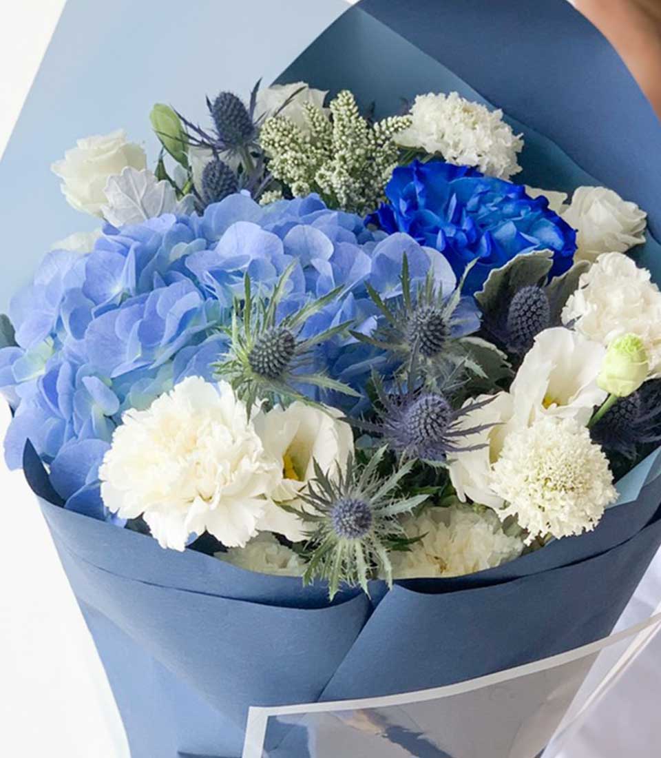Vibrant Blue Luster Bouquet Majestic Blue and White Floral Bouquet with rich hydrangeas and elegant roses, perfect for weddings, anniversaries, birthdays, and luxury gifts. Wrapped in navy tones for timeless sophistication with personalized message cards available.