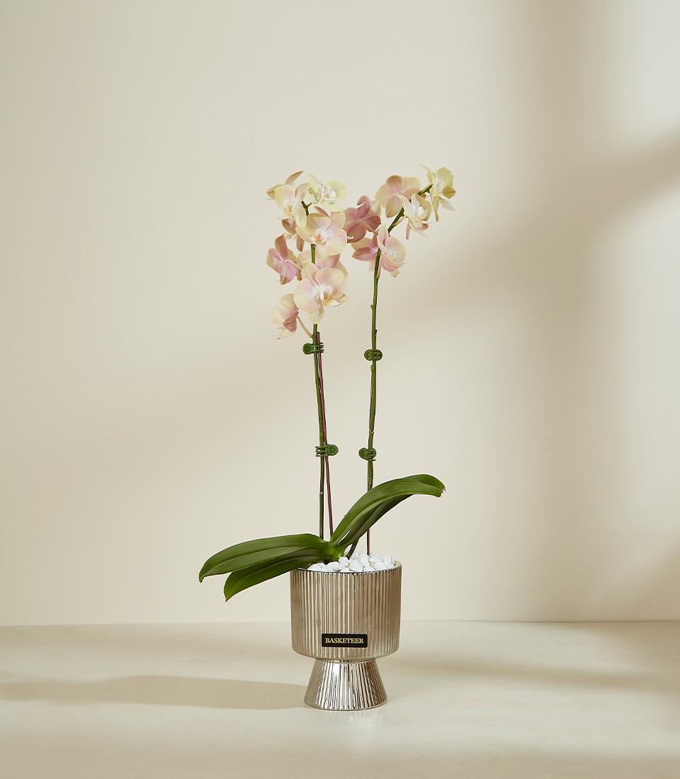 Add sophistication to any space with our Elegant Orchid Duo in a stylish vase. Perfect for enhancing home or office decor with natural beauty.
