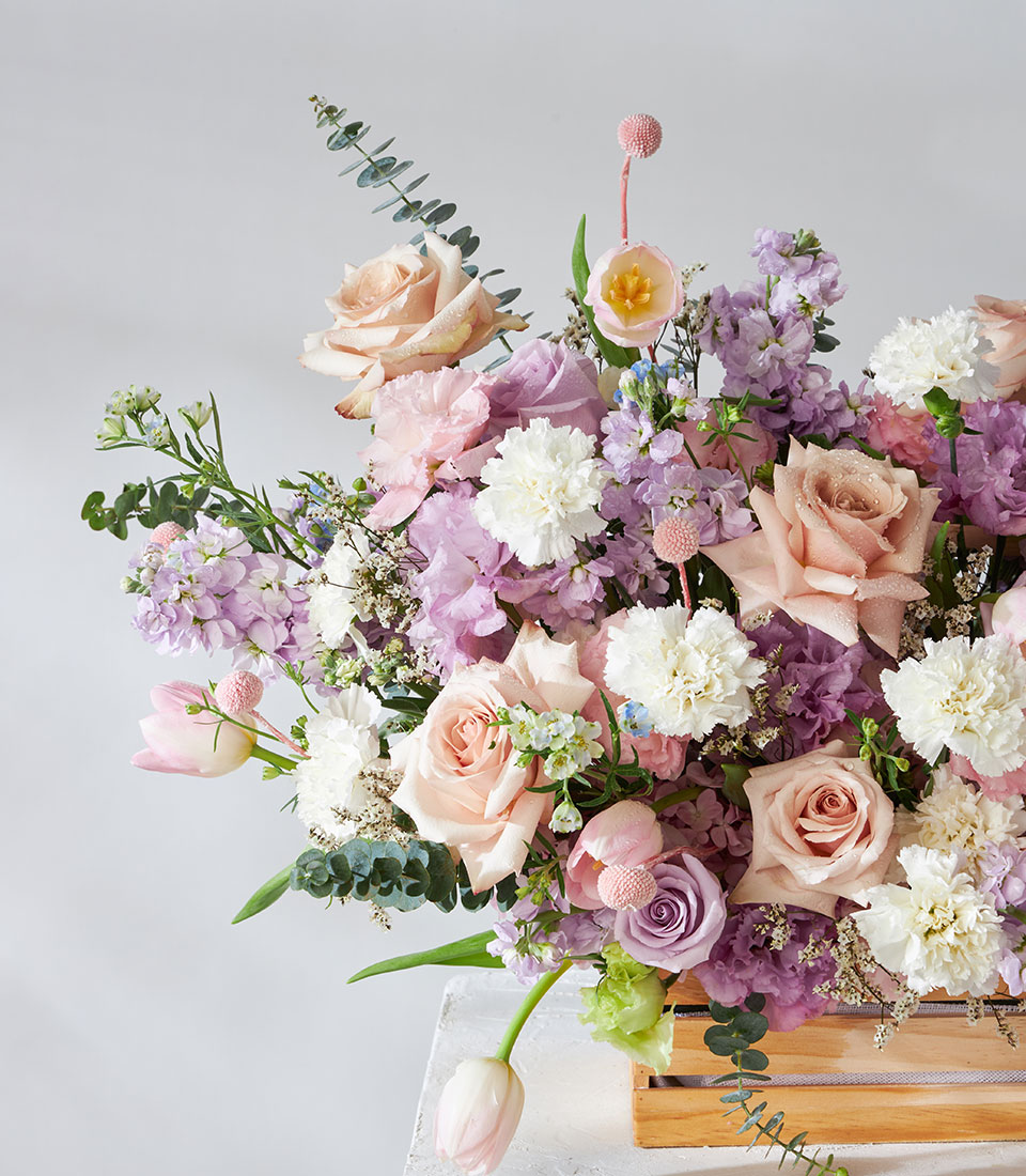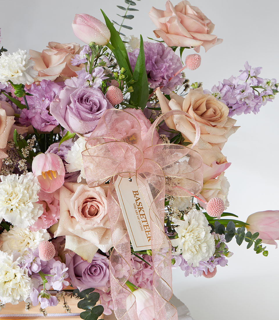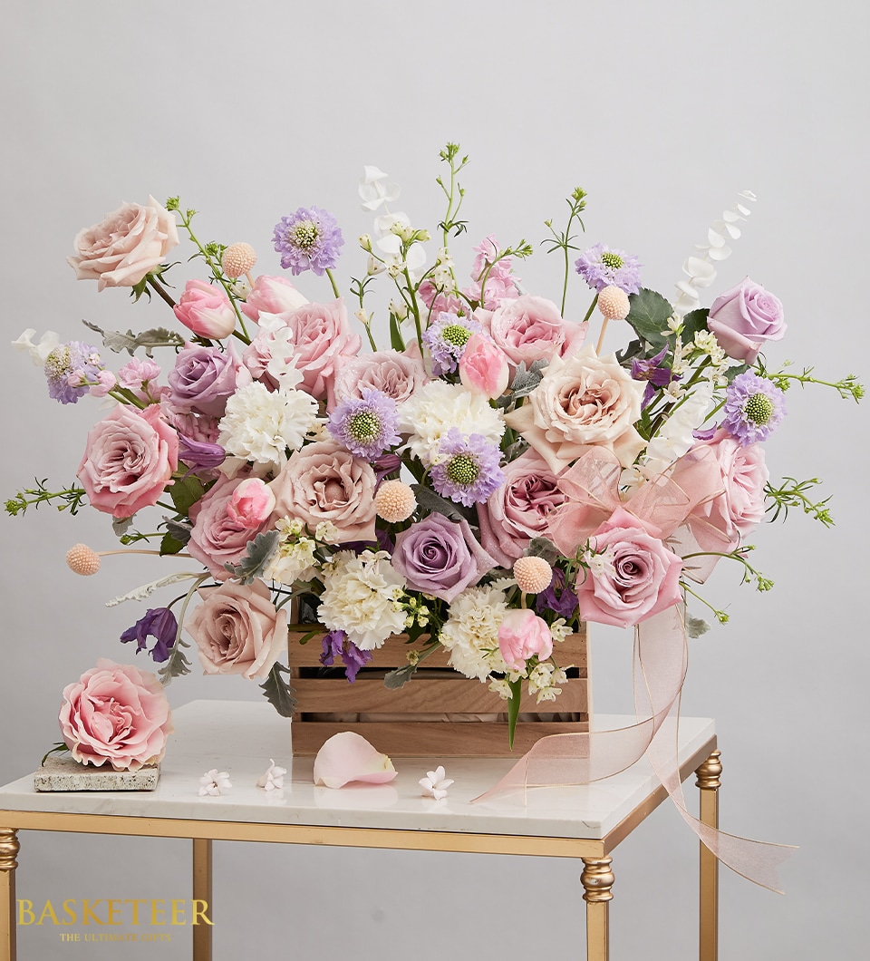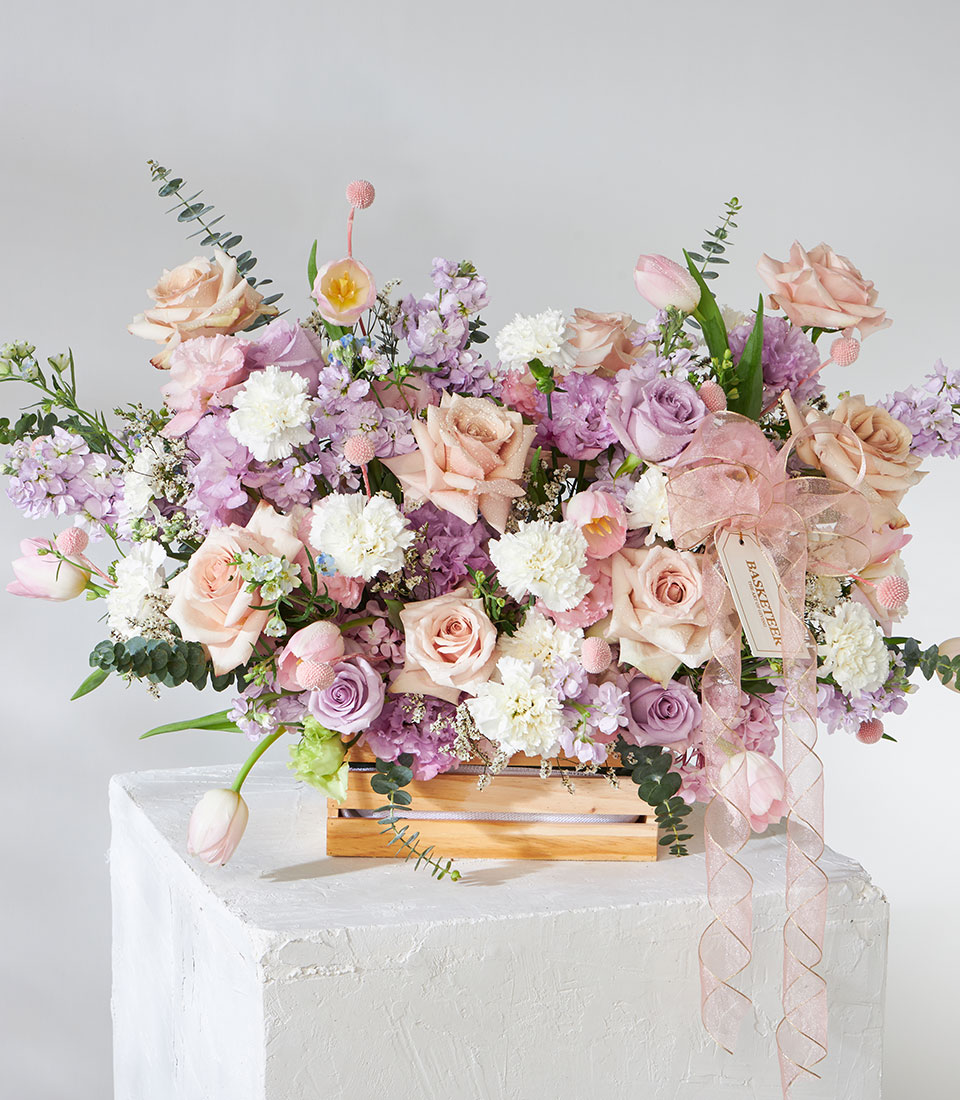 Pastel Romance Flower Arrangement Basket Delicate and graceful, this pastel floral arrangement features soft pink, blush, lavender, and creamy white blooms including roses, carnations, and scabiosa. Arranged in a rustic wooden crate and finished with a sheer pink ribbon, it radiates elegance and tenderness.