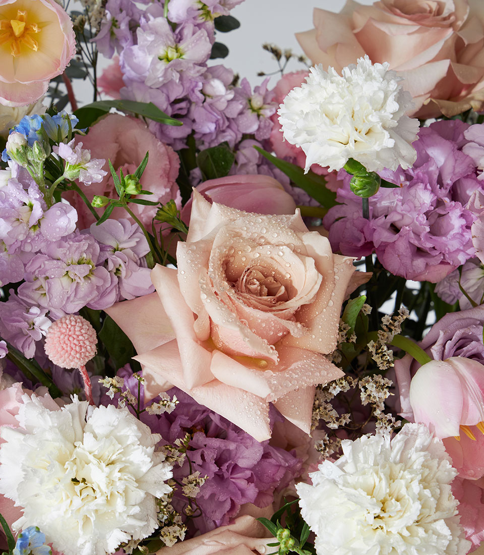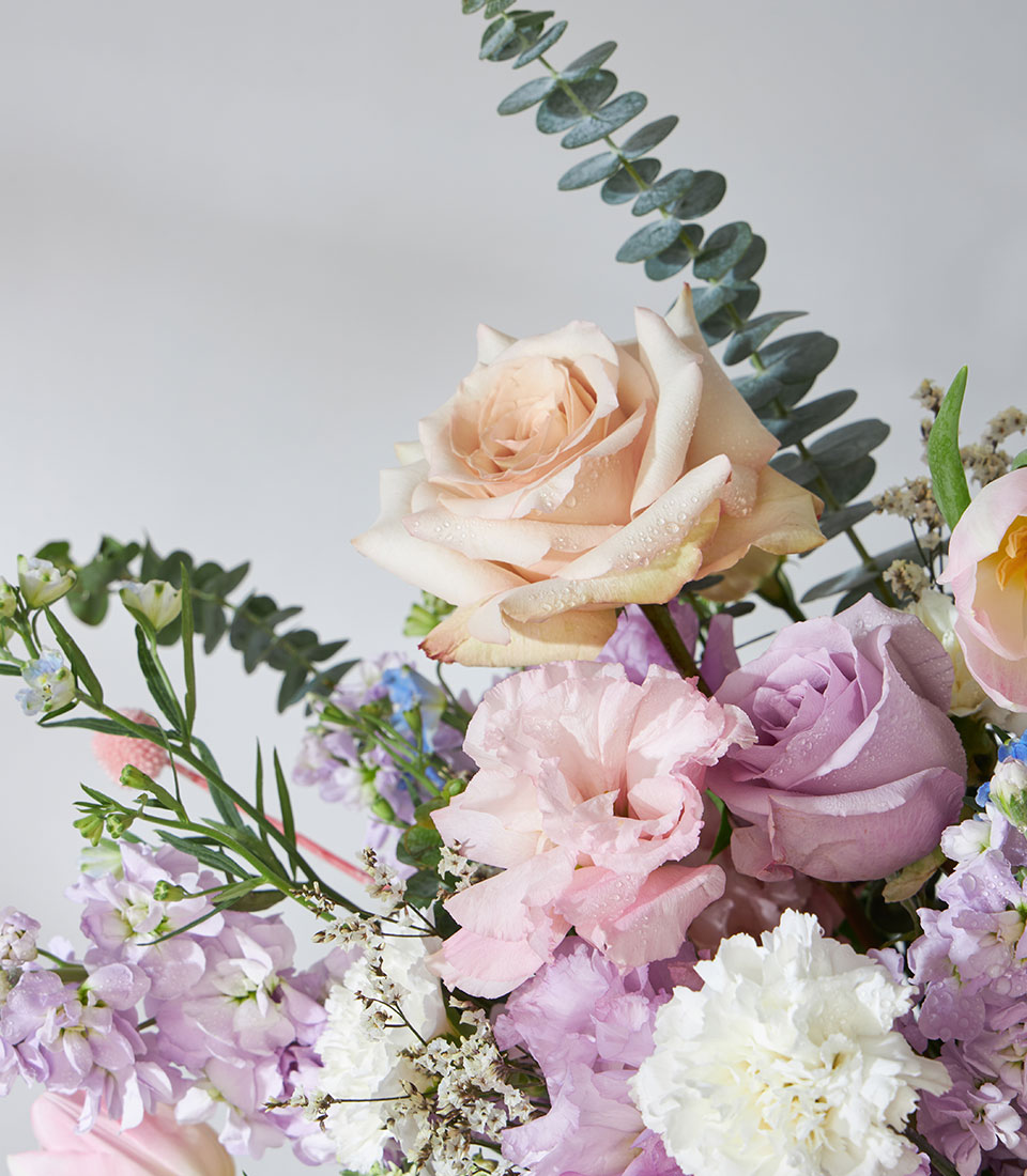 Pastel flower arrangement in soft pink, lavender, and cream tones, ideal for love, congratulations, or thoughtful gifting.