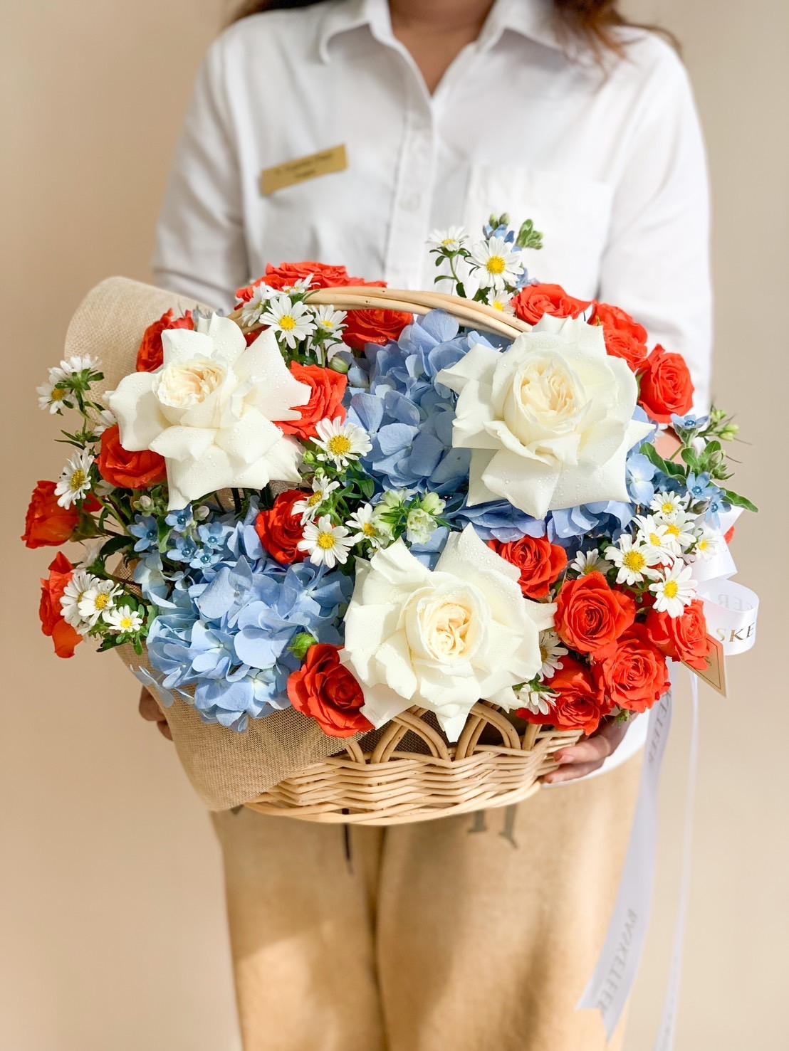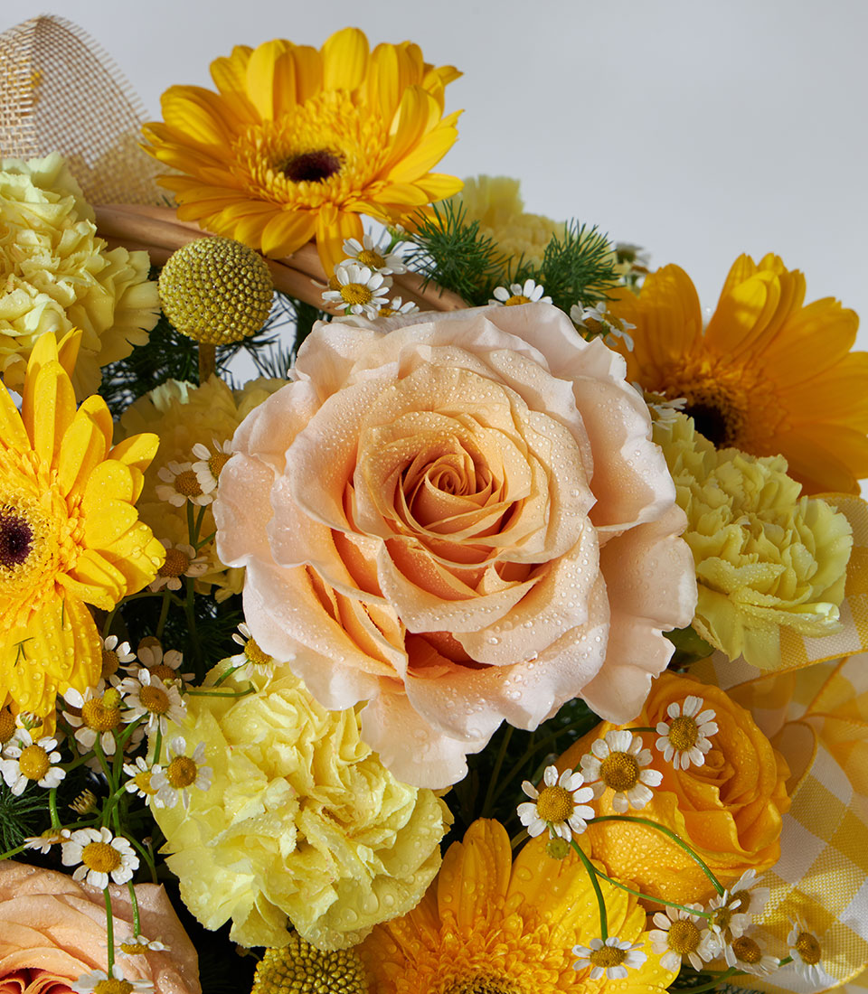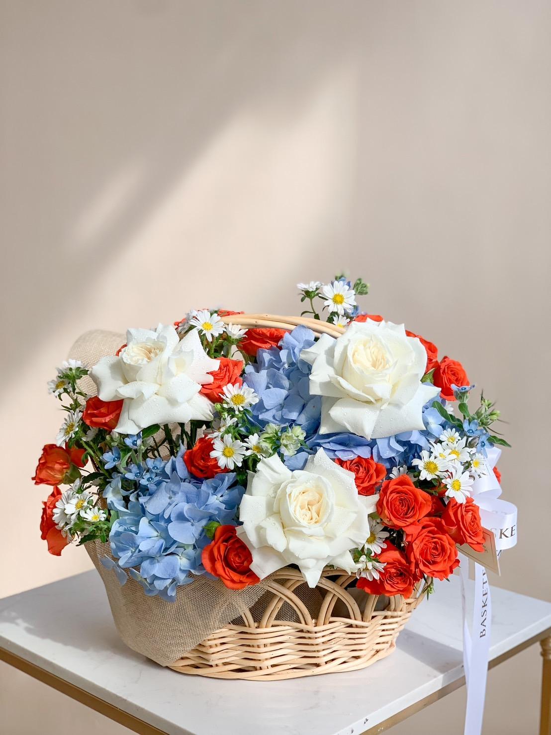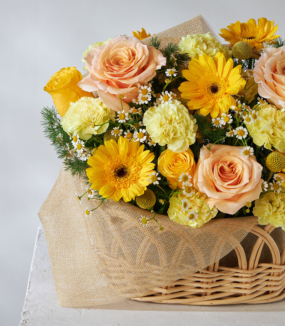 A cheerful floral basket featuring vibrant orange and yellow roses, a perfect gift to congratulate someone special and brighten their day.