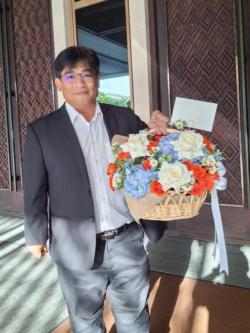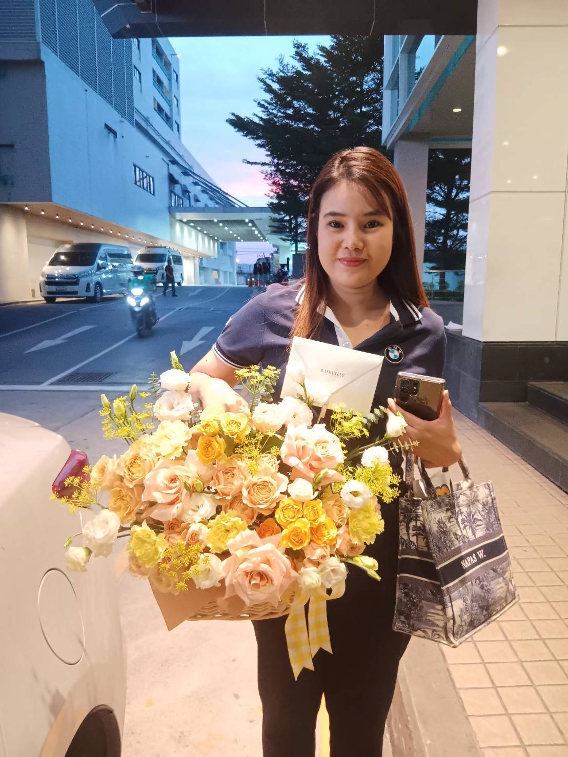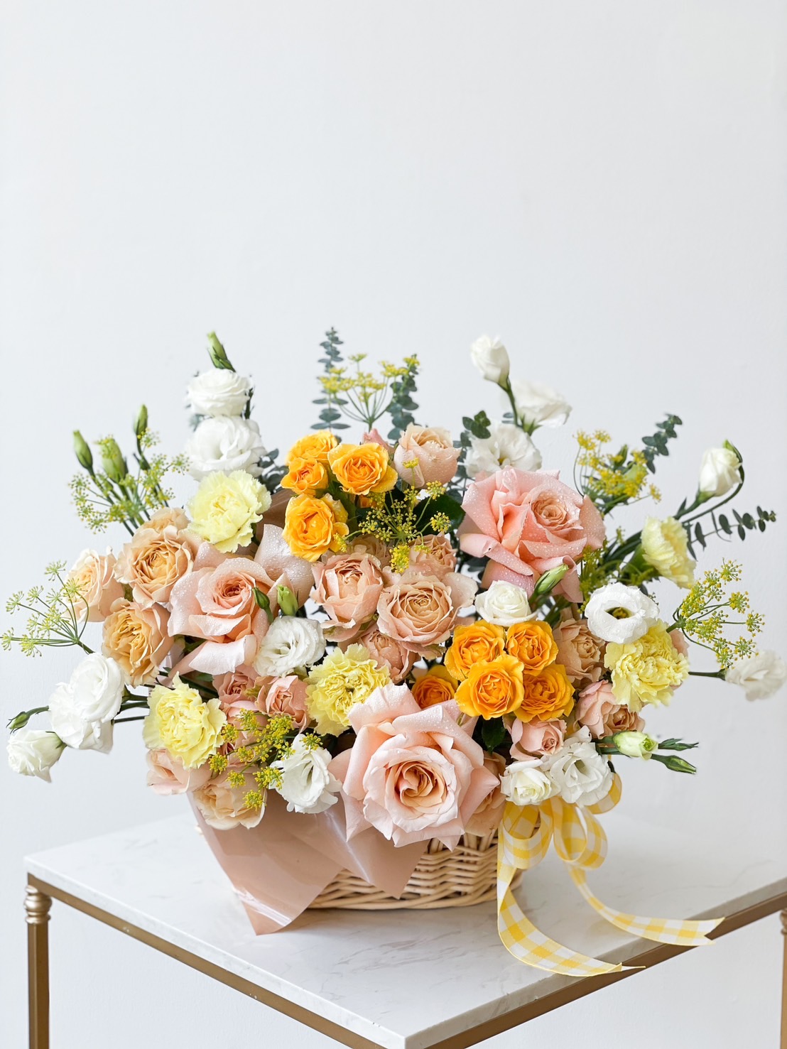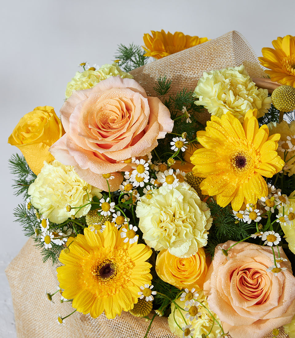 A cheerful floral basket featuring vibrant orange and yellow roses, a perfect gift to congratulate someone special and brighten their day.