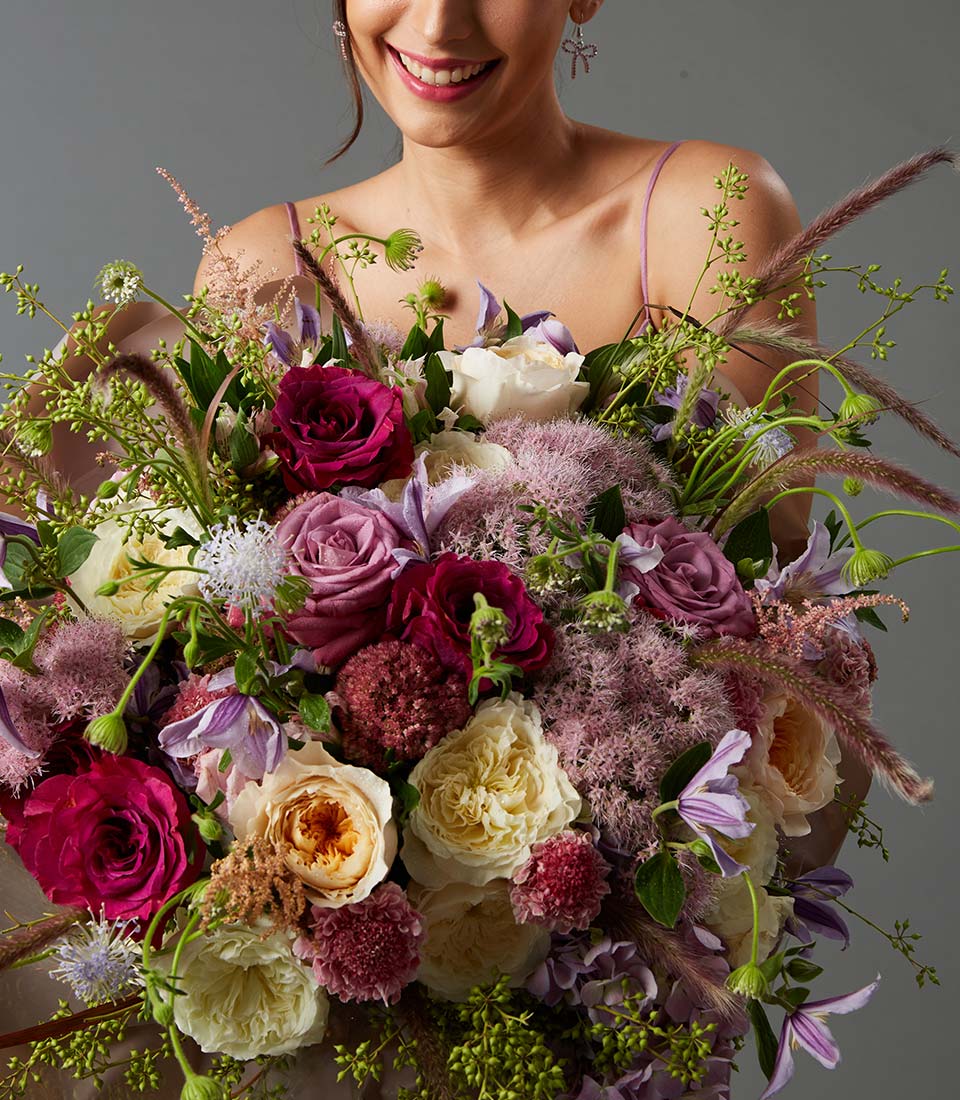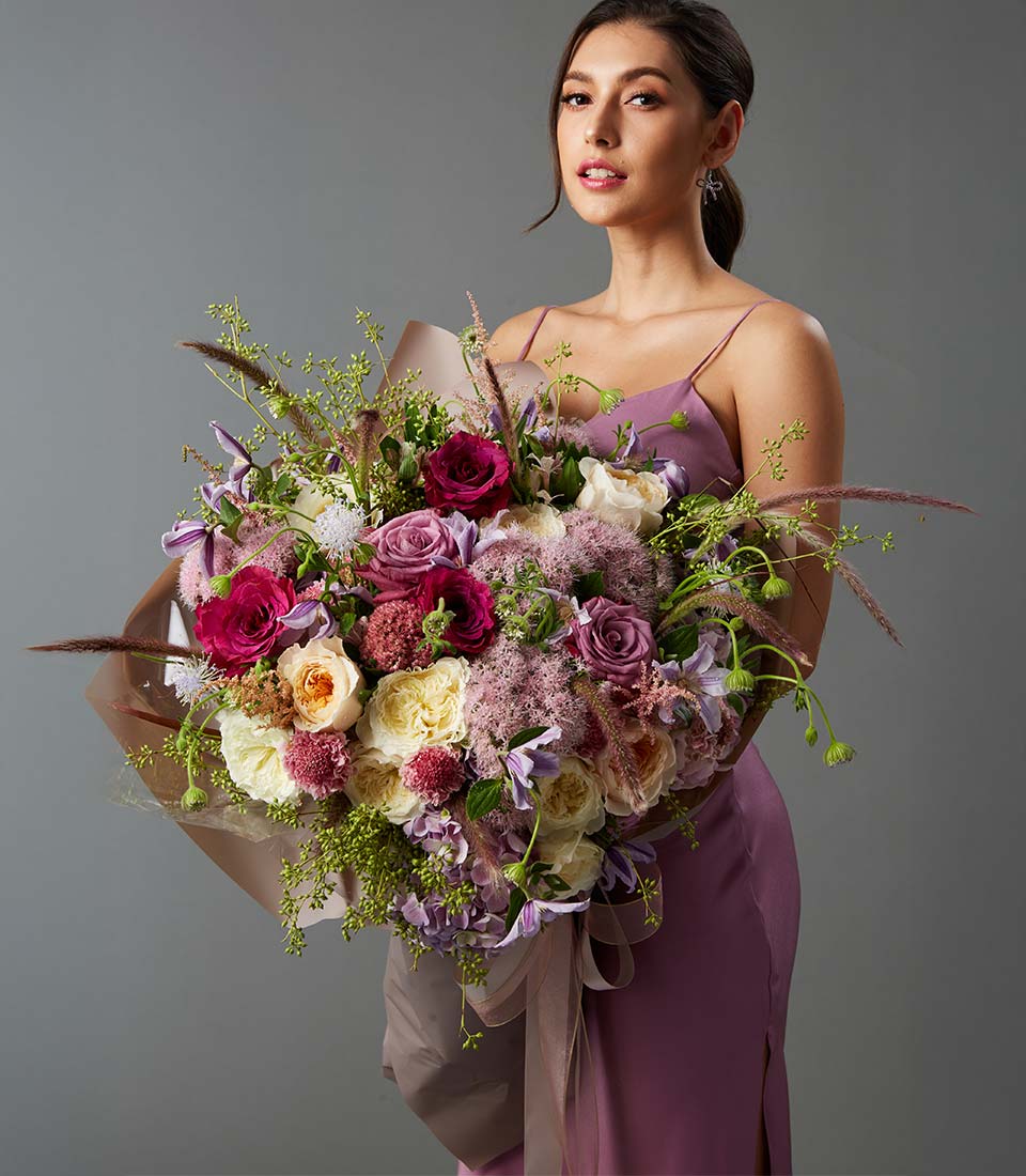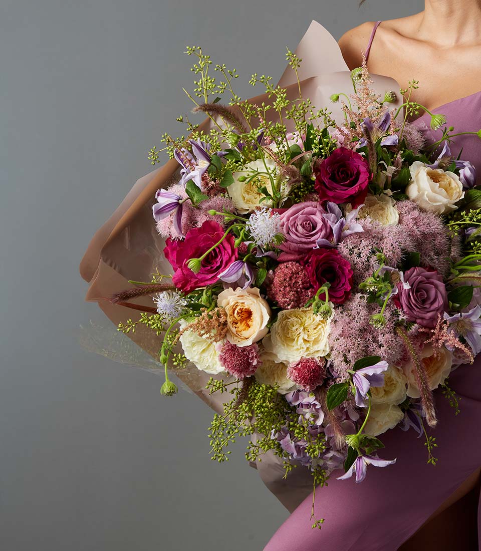 Express love with a lush bouquet of wild roses, clematis, and delicate foliage—a stunning floral masterpiece for grand gestures.