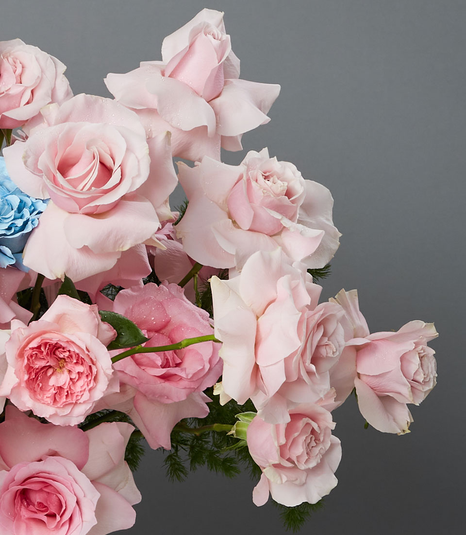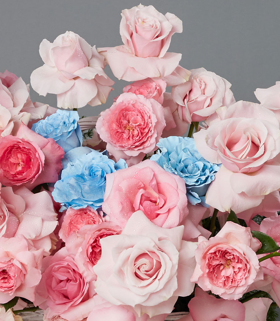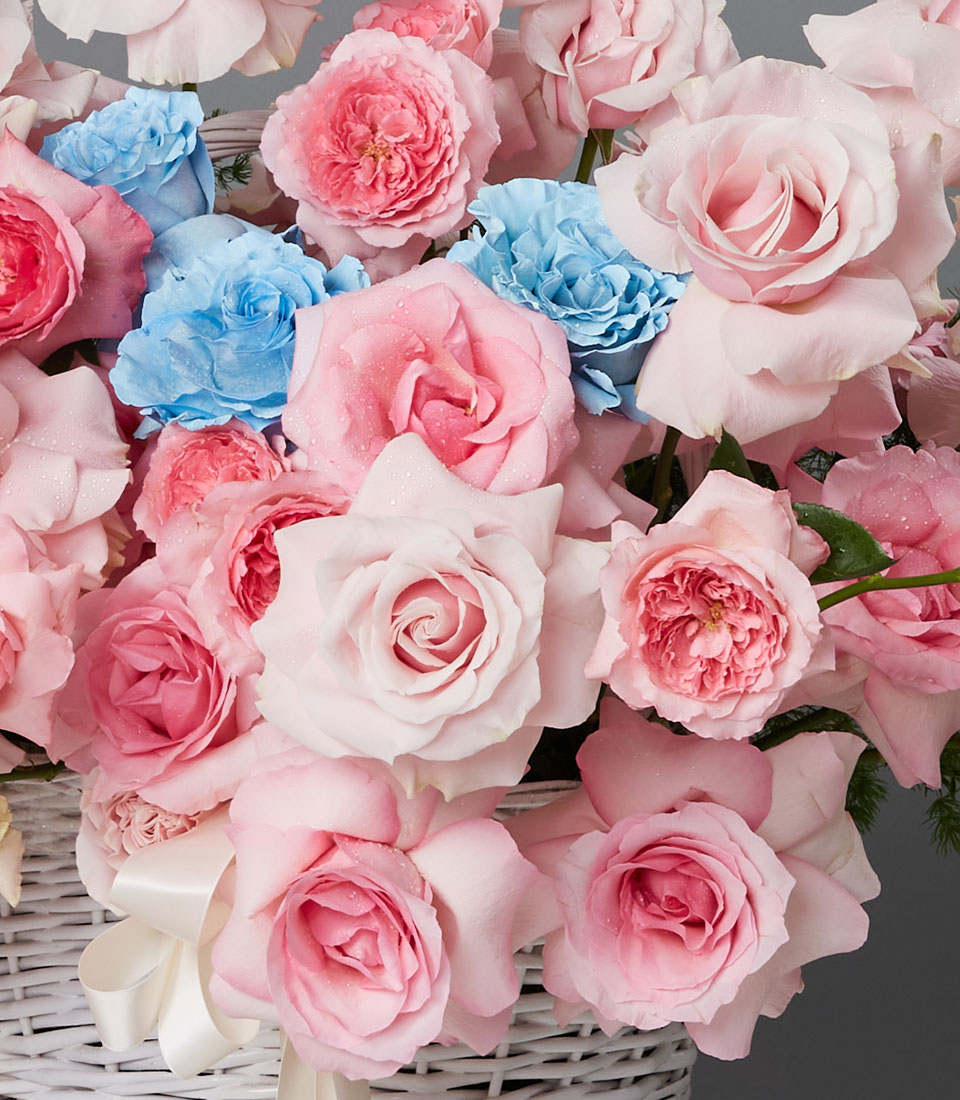 Sweet Blush Blossoms Flowers Basket This luxurious floral basket blends classic beauty with modern charm. Overflowing with delicate pink roses, garden roses, and pops of fresh blue hydrangeas, the arrangement is presented in a white woven basket and finished with a soft satin ribbon.