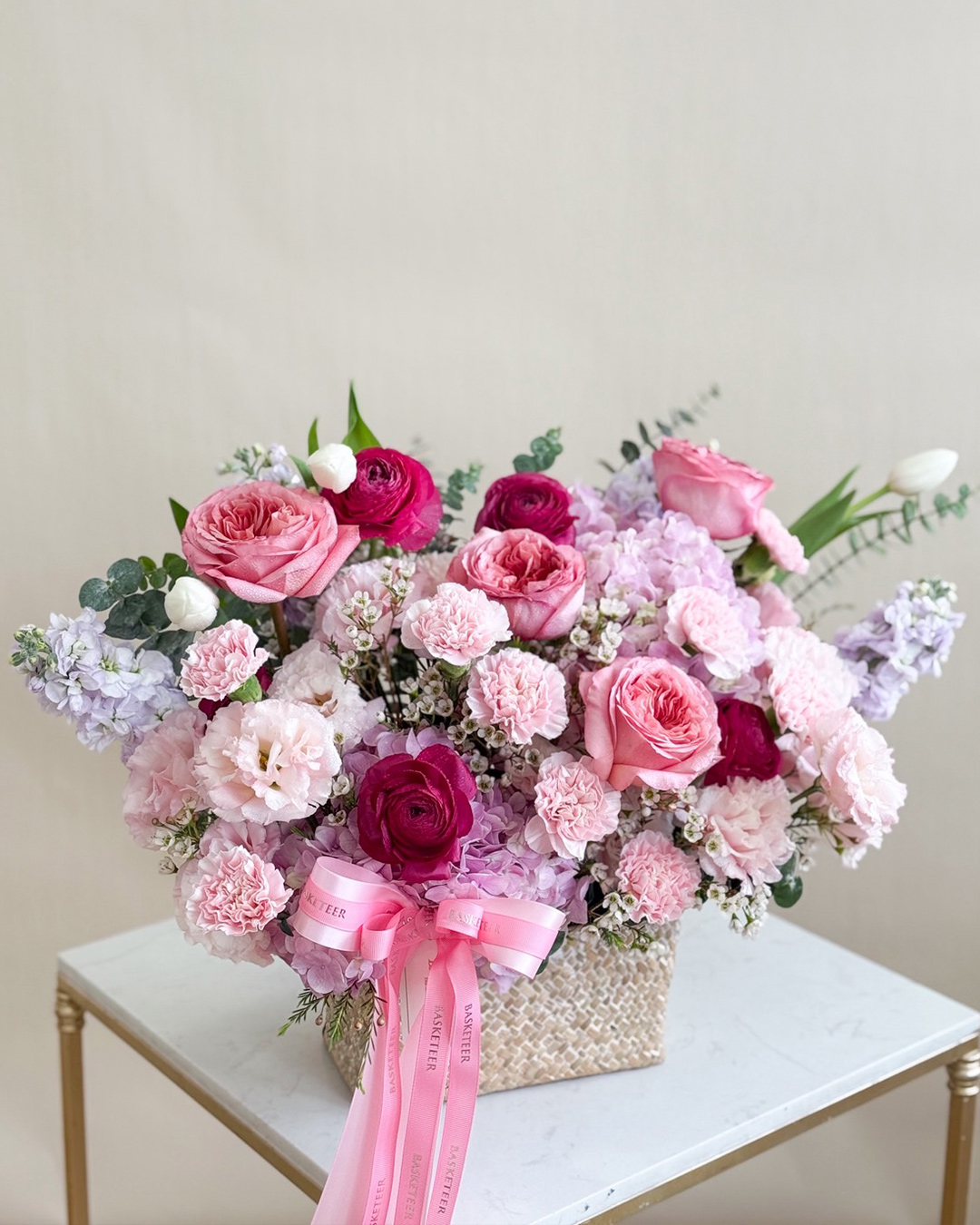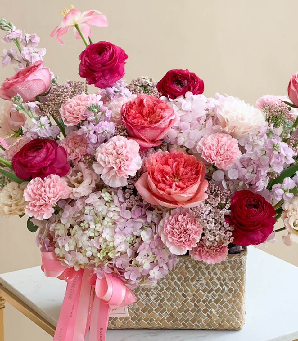 Stunning floral basket featuring a mix of pink and red roses, hydrangeas, and seasonal blooms. Perfect for special occasions, celebrations.