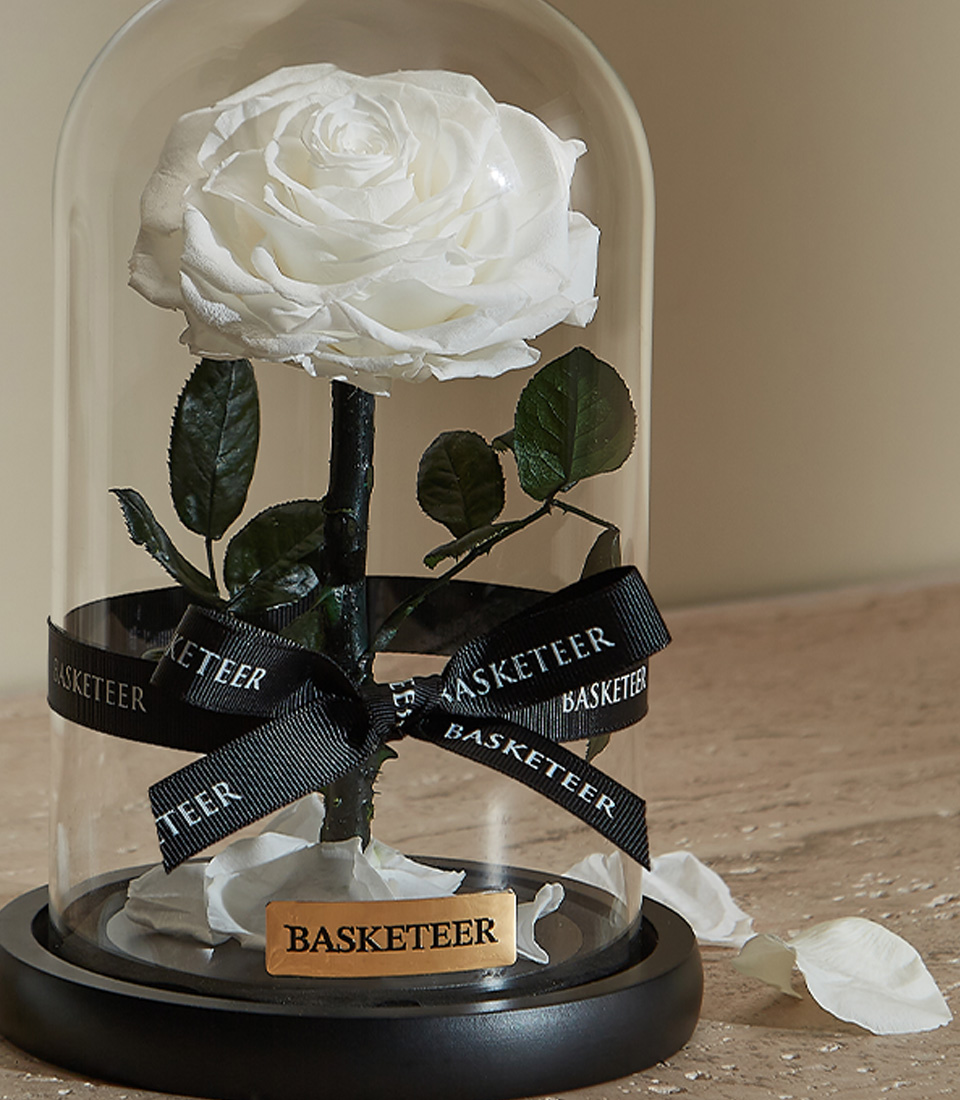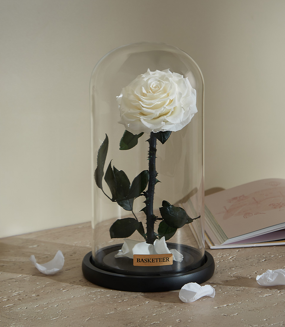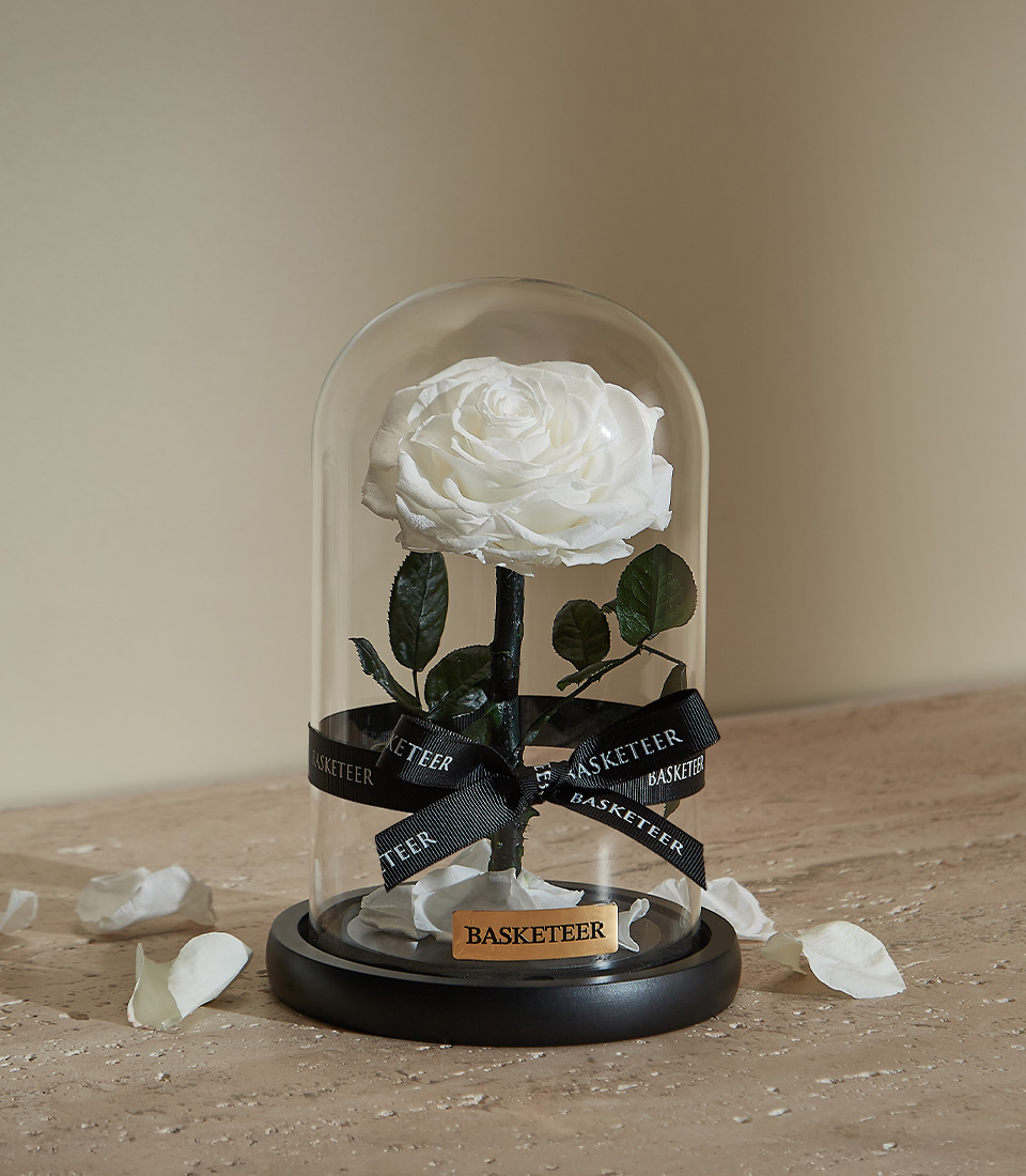 A stunning preserved white rose in a glass dome, symbolizing purity and eternal love. A perfect gift for special occasions.
