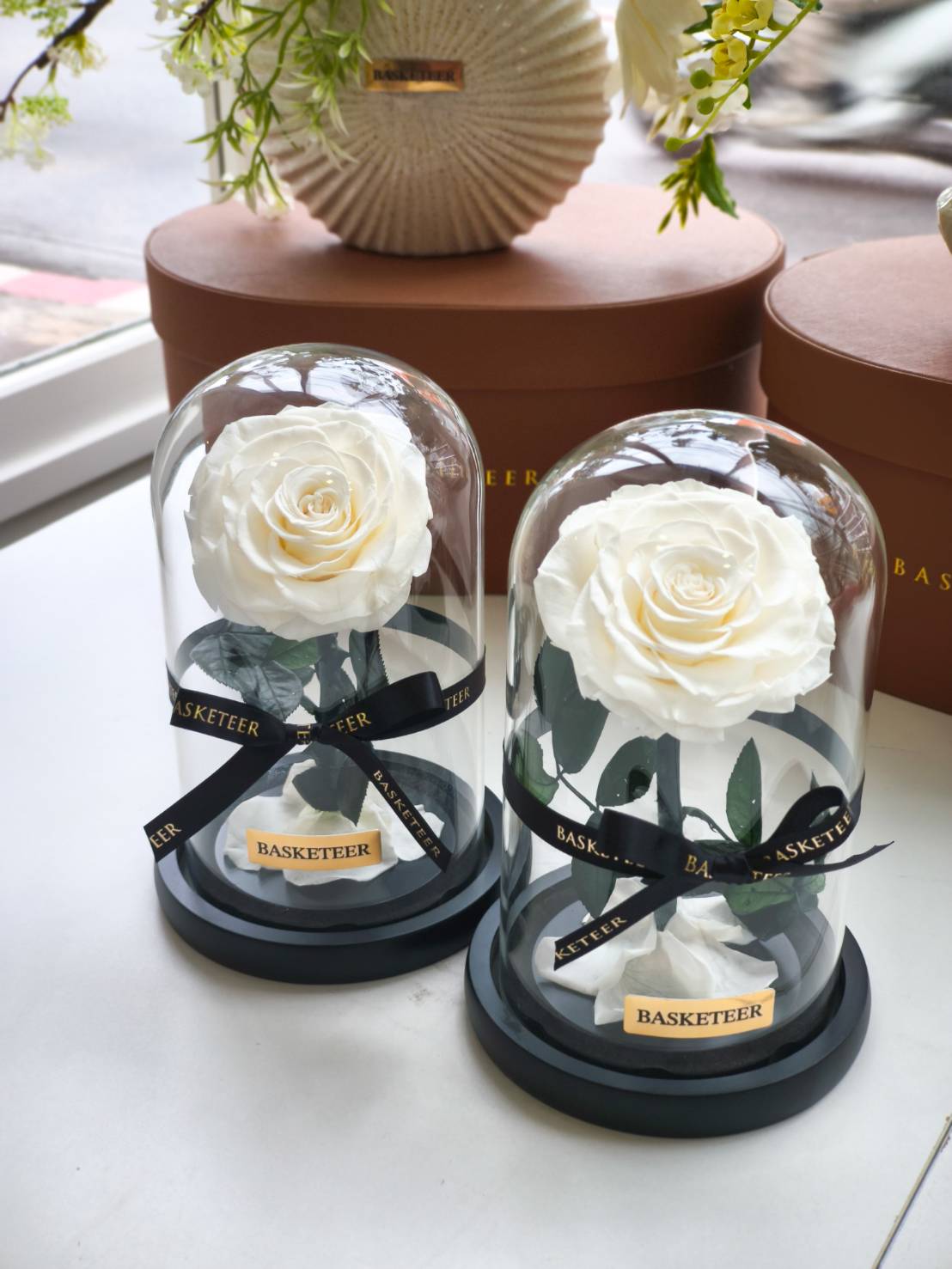 Eternal White Rose in Glass Dome Embodying purity and eternal love, this luxury white preserved rose duo is a timeless gift. Encased in a premium glass dome, each handcrafted rose exudes elegance, making it perfect for anniversaries, weddings, and sophisticated home décor.