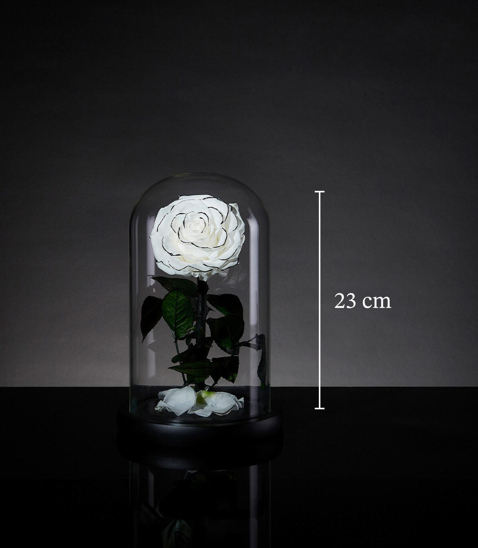 Preserved Eternal Snow Roses Gift Celebrate the beauty of contrast with our Eternal Purity preserved white rose, delicately edged in black. This unique rose combines the symbolism of purity with a touch of bold elegance, making it an exquisite gift for special occasions or as a statement piece in any space. The preserved rose maintains its stunning appearance for years, offering a timeless reminder of nature's elegance.